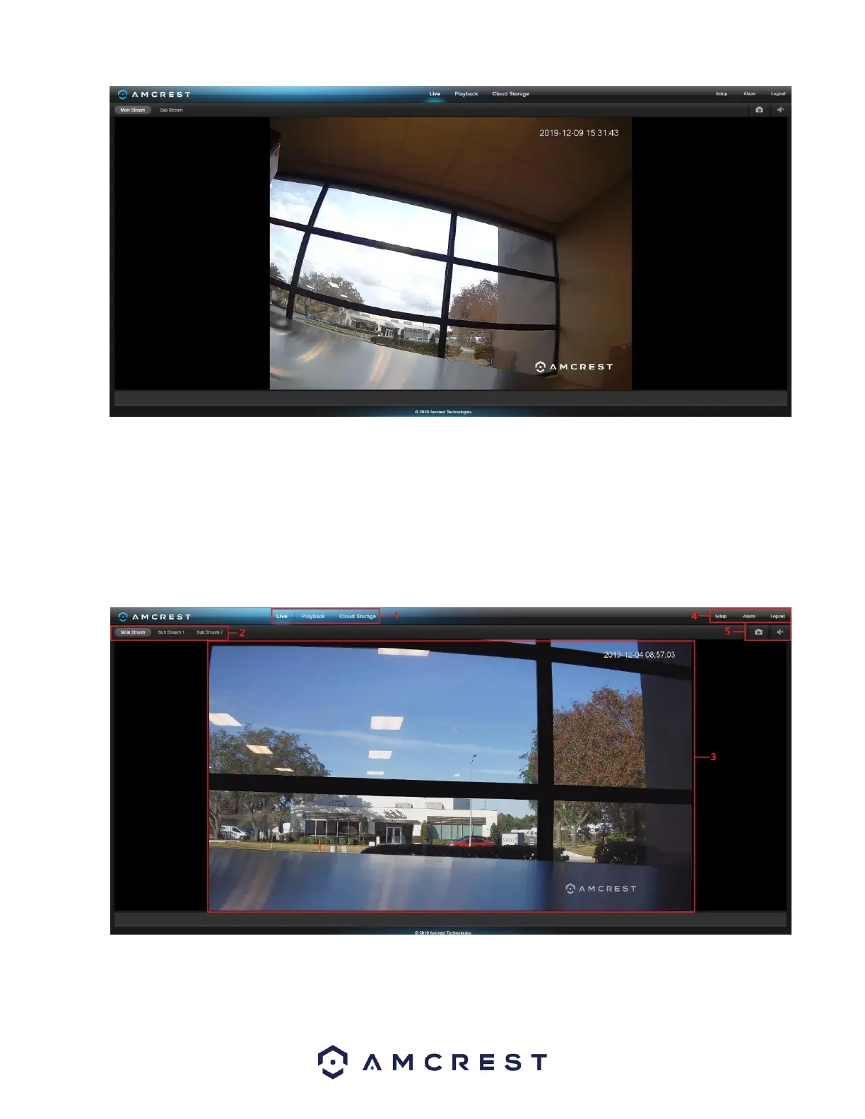 Section 1: These options allow the user quick access to the live view screen, playback, as well as to the Amcrest Cloud. Section 2: This