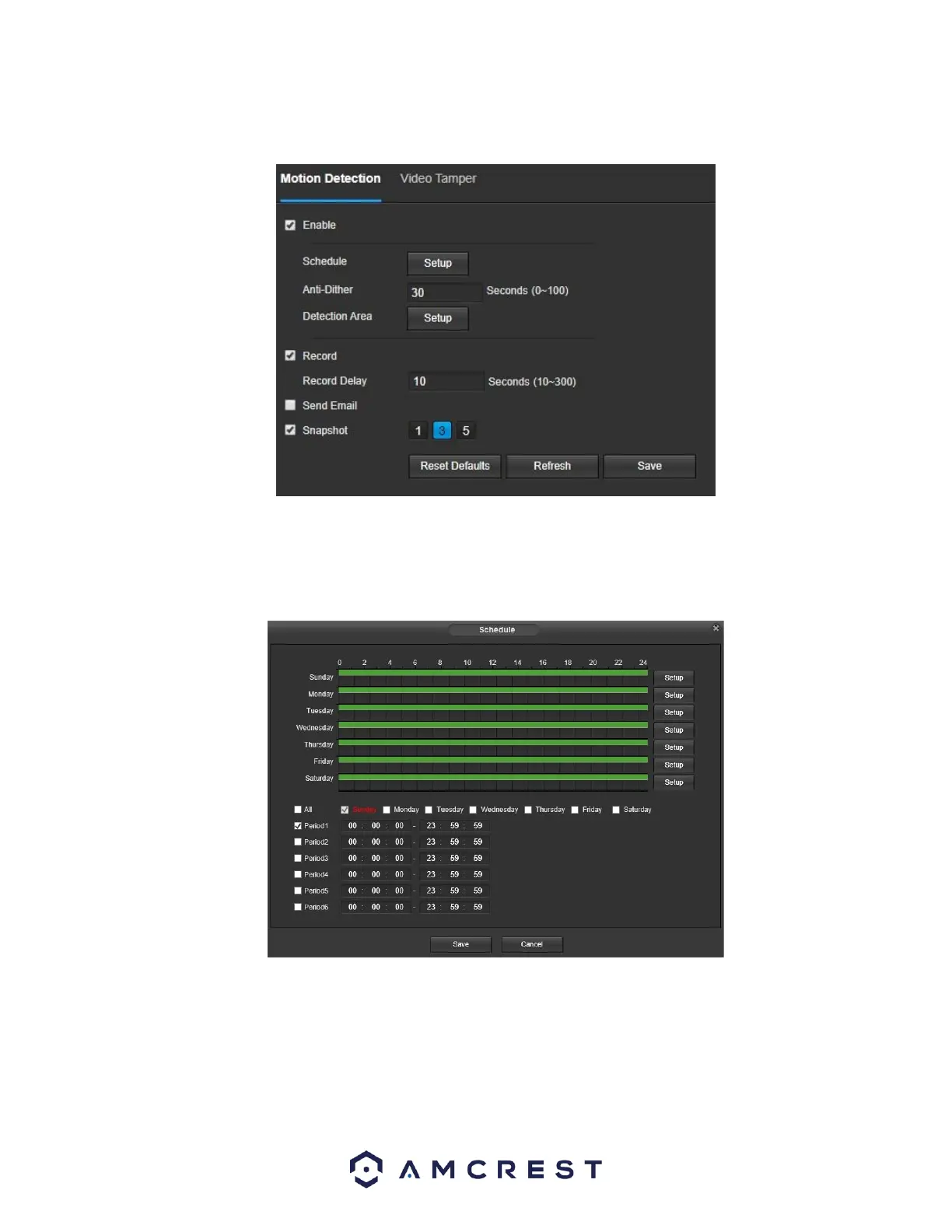o Click and drag to set motion detection for certain days of the week. Also, periods of motion detection can be set for each day and