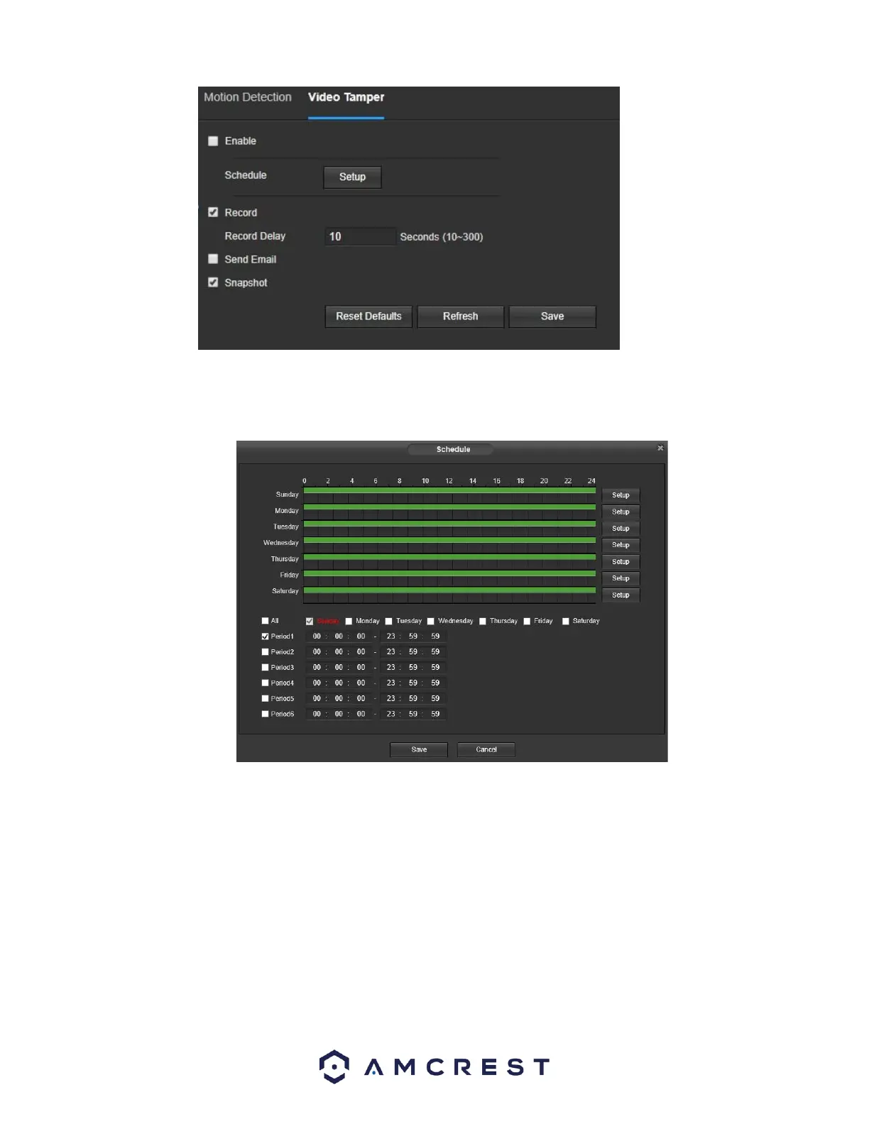 o Click and drag to set video tampering for certain days of the week. Also, periods of video tampering can be set for each day and