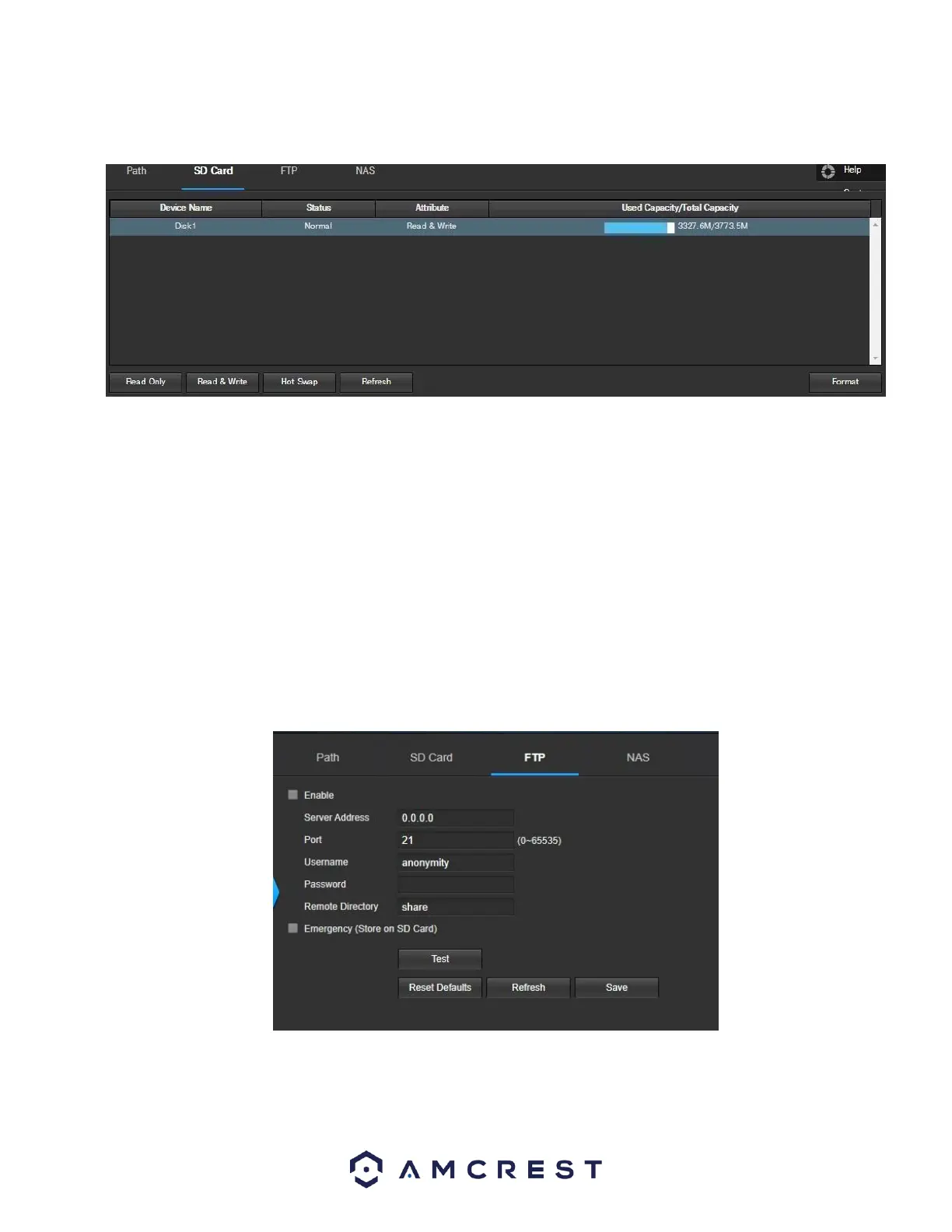 • Used Capacity/Total Capacity: This column shows the available memory on the SC card. Read Only: This button allows the user