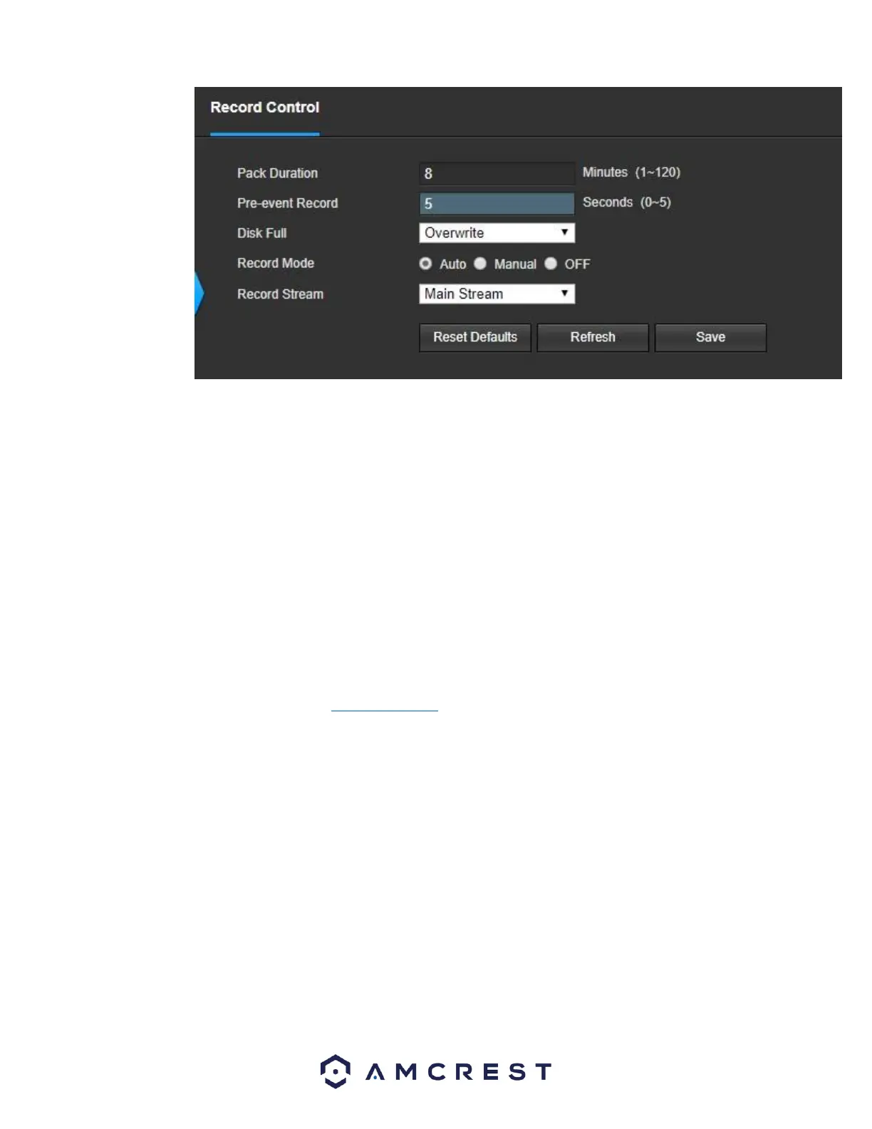 • Record Mode: This set of radio buttons allows the user to designate the recording mode. The options are Auto, Manual, and Off.