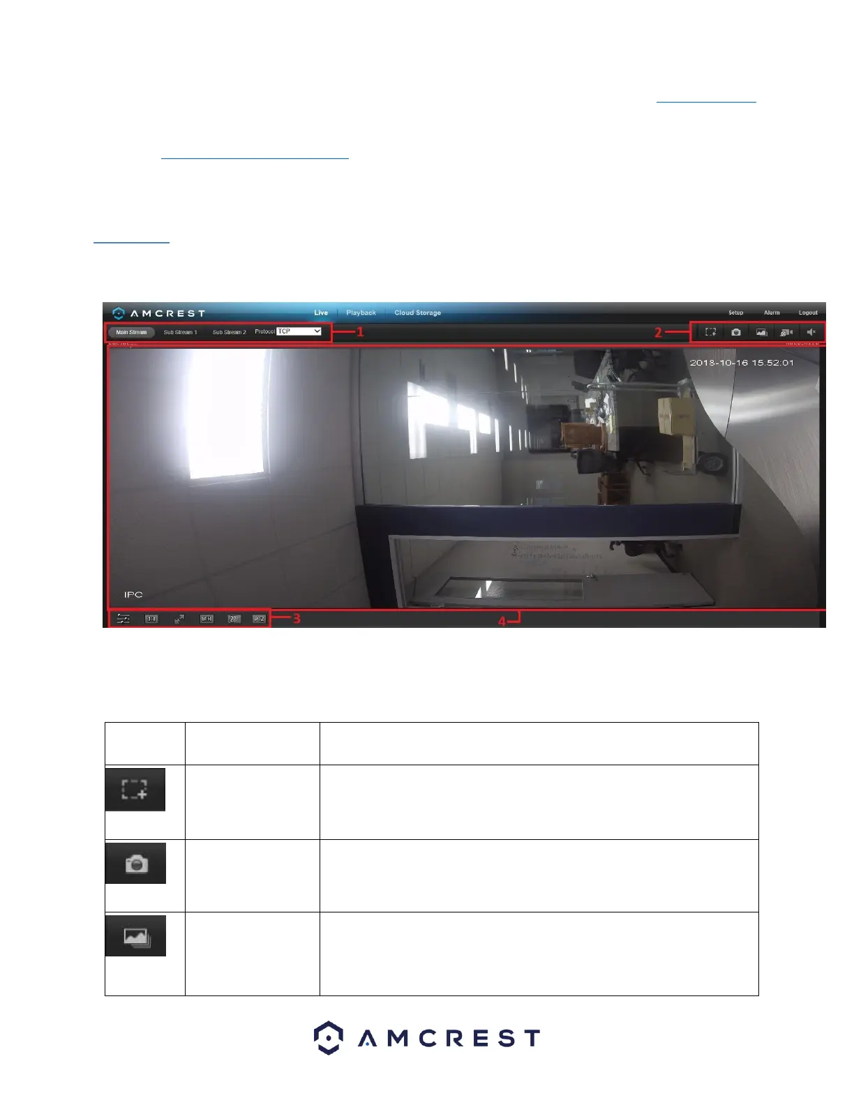 Section 2: The functions bar allows the user to perform different camera functions while in live mode. See the table below for an