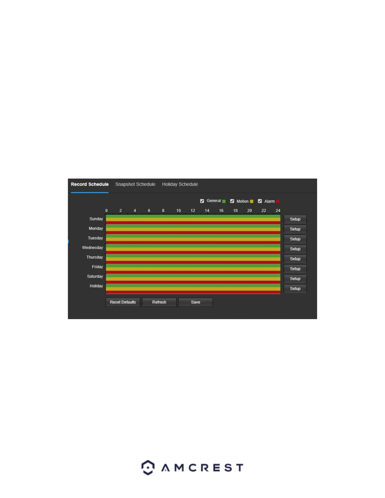 This tab is where video recording settings are configured. Below is a screenshot of the Record Schedule settings
