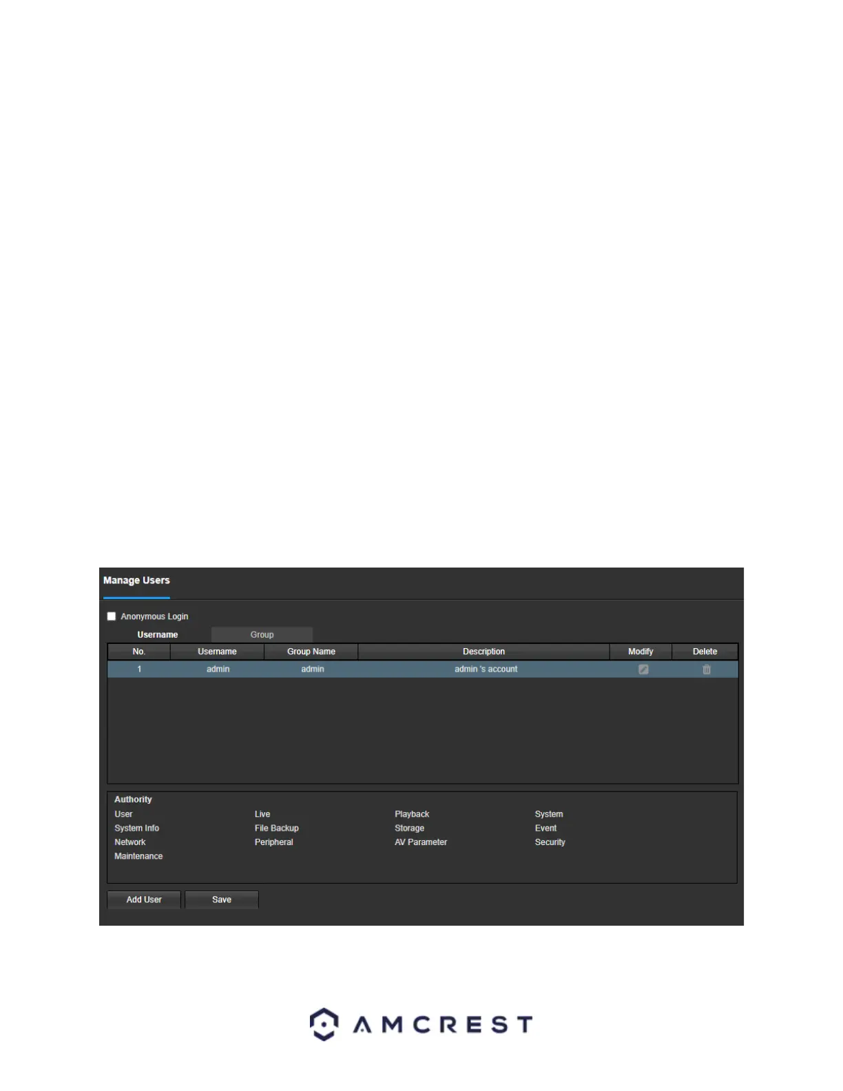 account which has all rights/authorities. Additional accounts can be created on this screen. Below is a screenshot