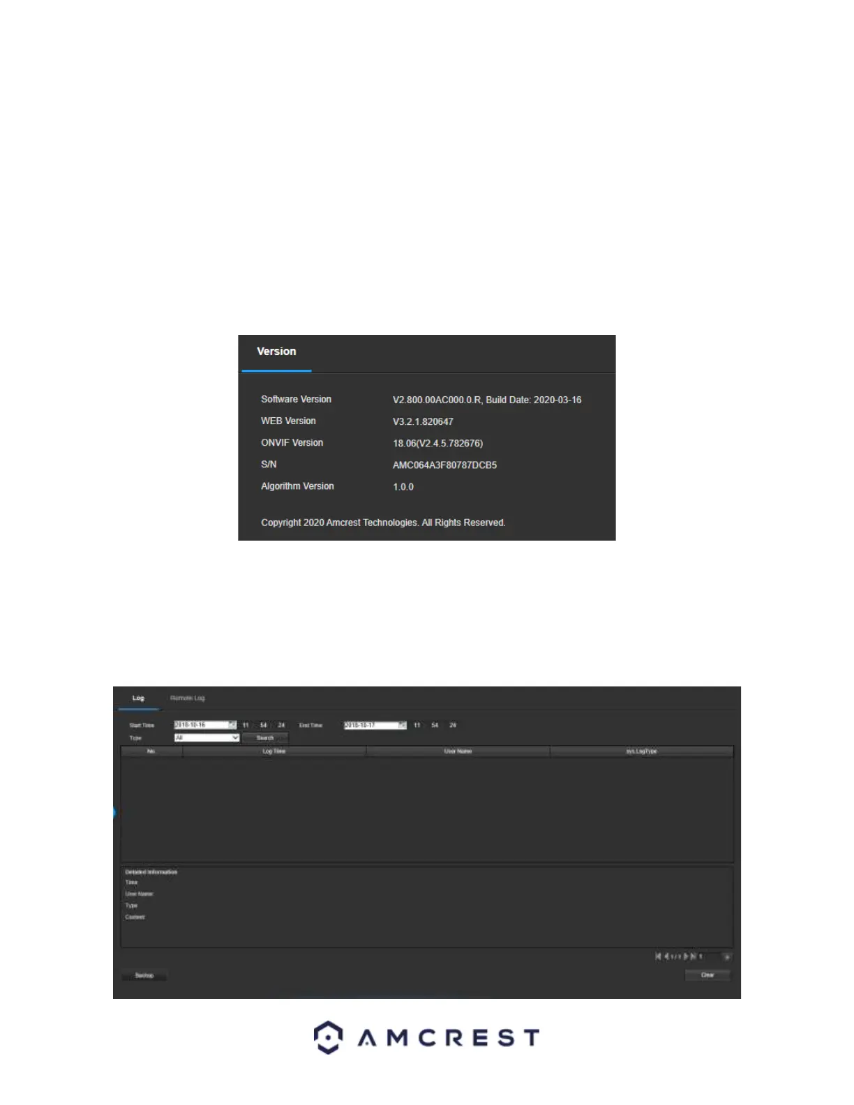 This screen is where the camera’s activity log is kept. Below is a screenshot of the Log screen: