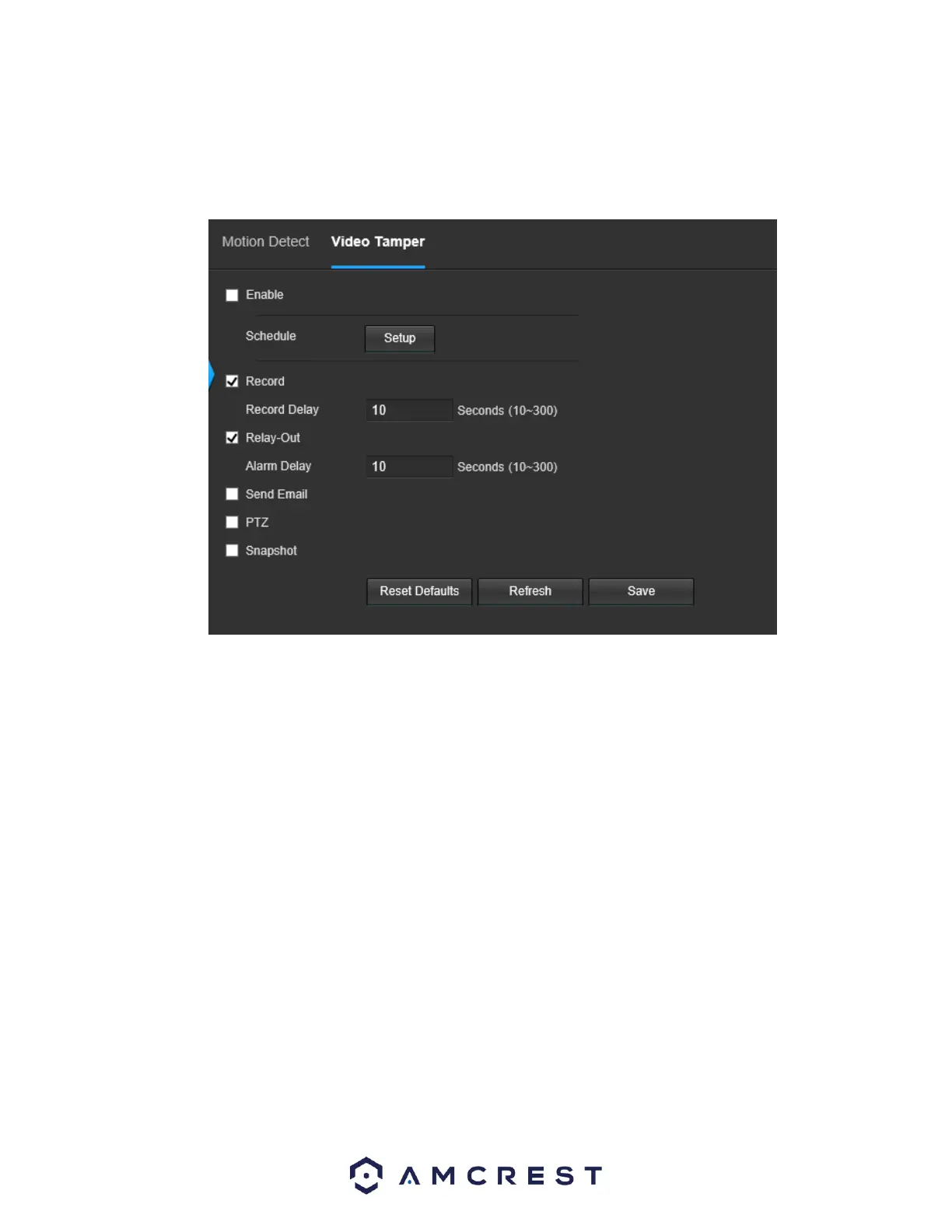 Below is an explanation of the fields on the Video Tamper tab: