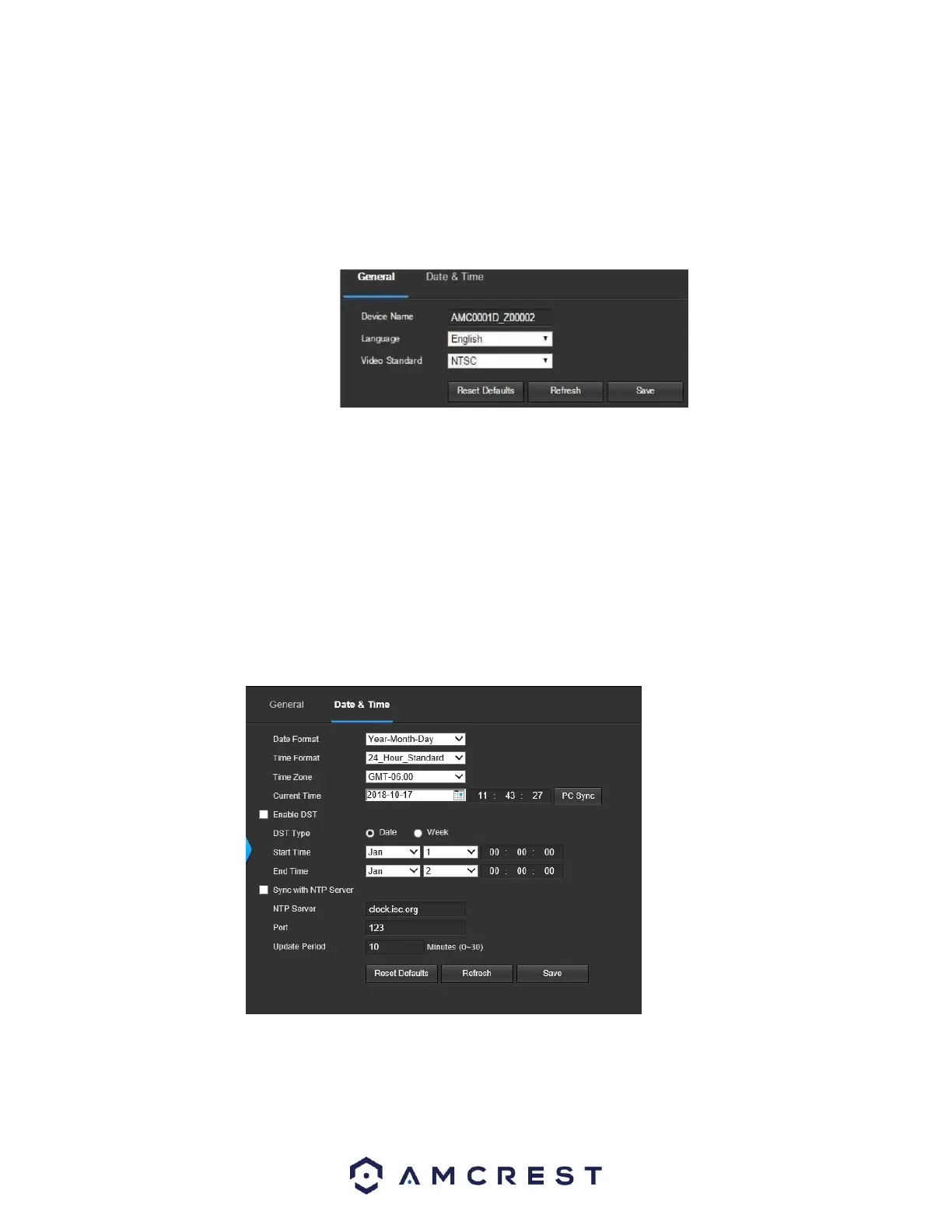 This tab is where the user can configure the date and time settings for the camera. Below is a screenshot