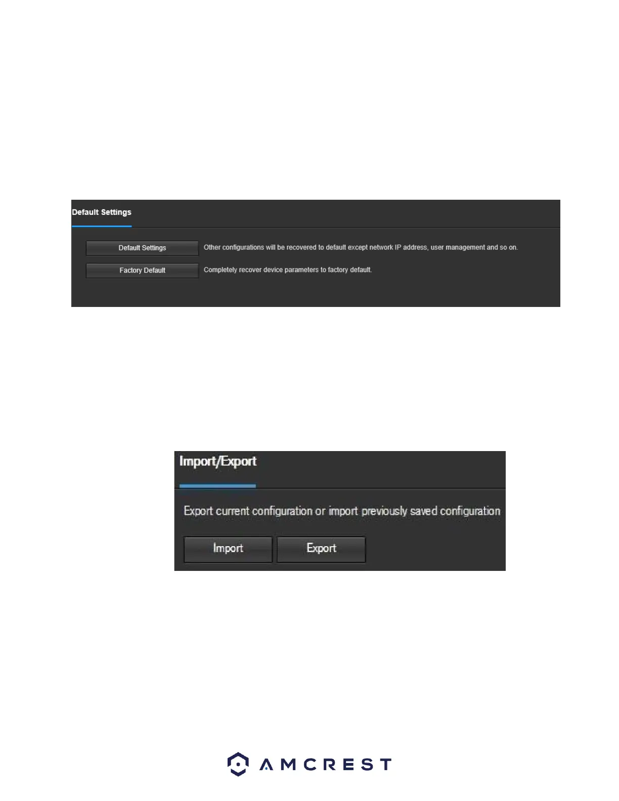 This screen allows the user to import or export settings from the camera. Below is a screenshot of the