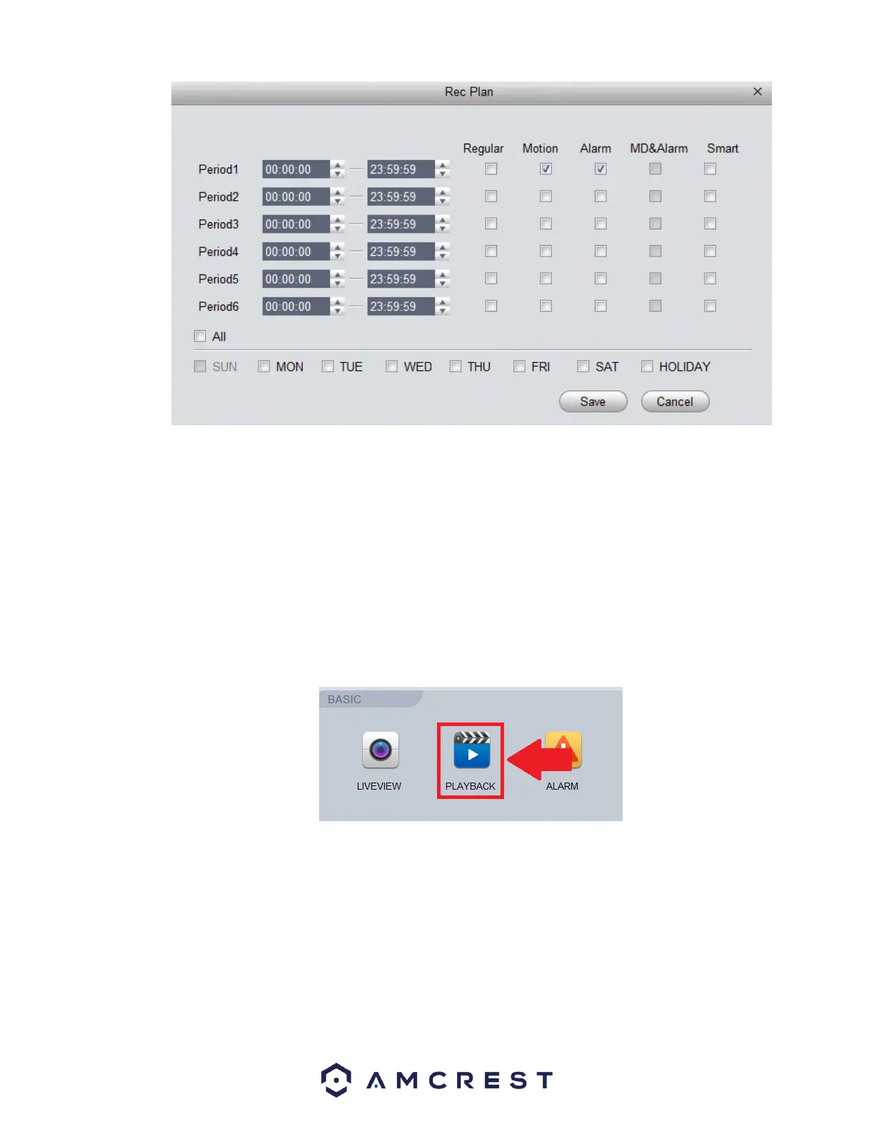 Clicking this button opens a screen that allows for recording periods to be set for each day and for each recording type. There are