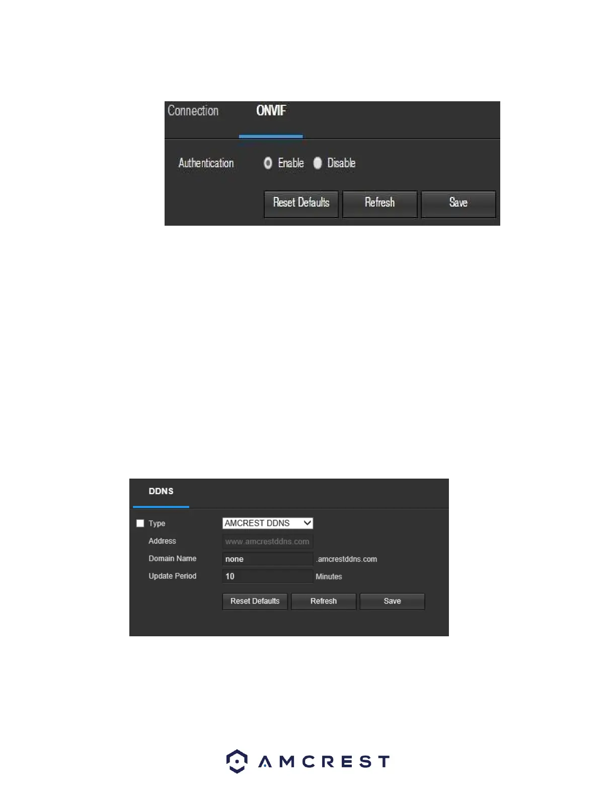 Below is a screenshot of the DDNS settings screen, configured to AmcrestDDNS: