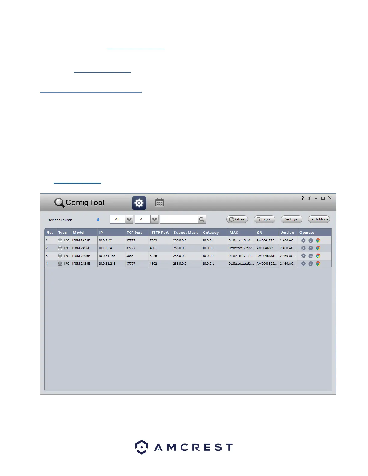 from www.amcrest.com under the “Support” tab, Apps & Software. The IP Config tool’s interface looks like the below image: