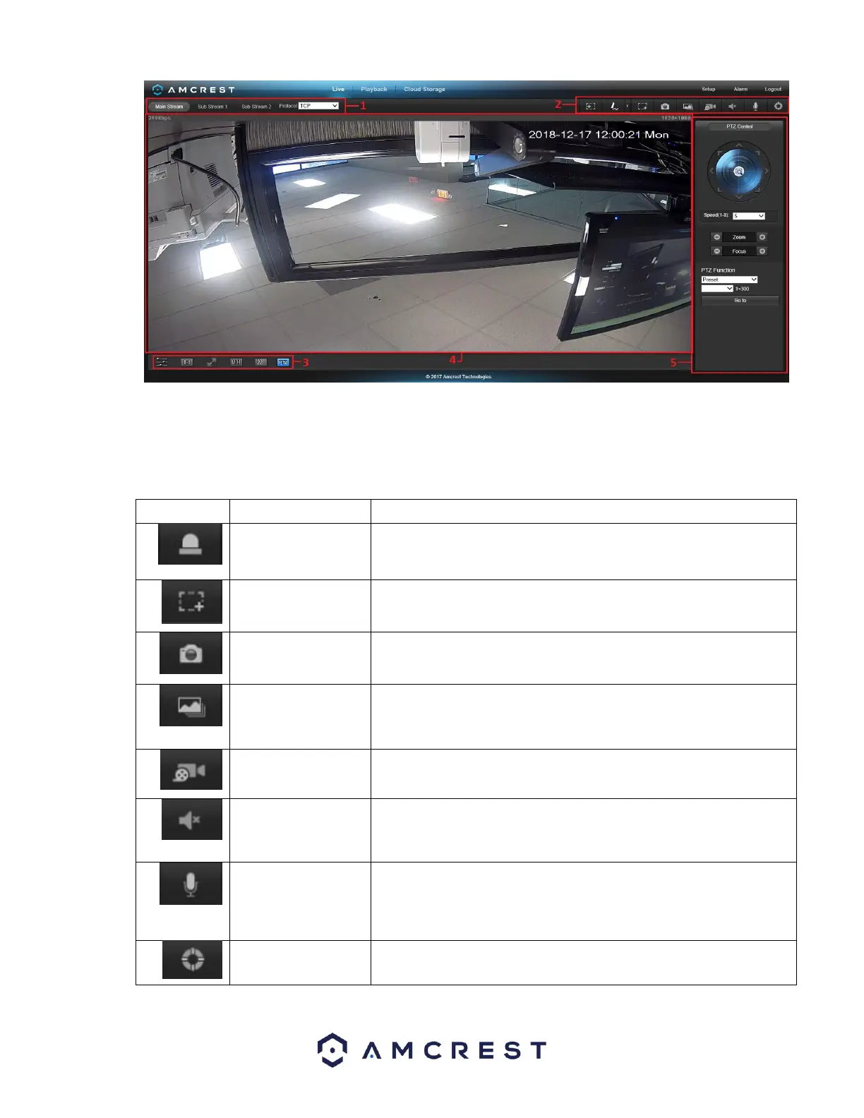 Section 2: The functions bar allows the user to perform different camera functions while in live mode. See the table below for an