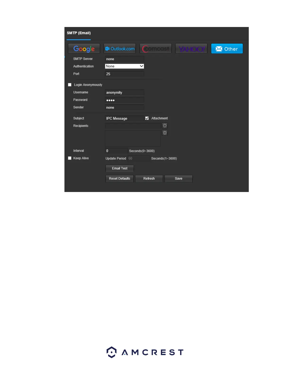 Below is an explanation of fields on the SMTP (Email) settings screen:
