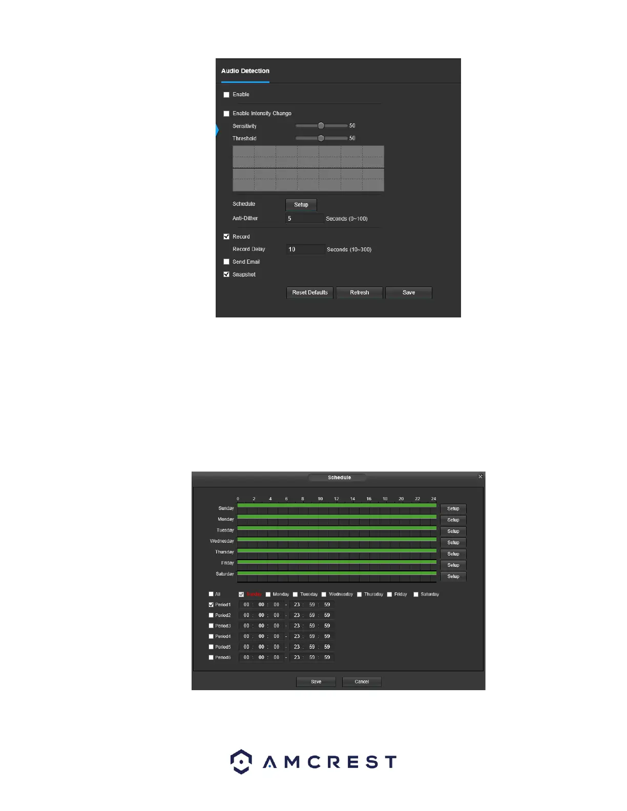 o Click and drag to set audio tampering for certain days of the week. Also, periods of audio detection can be set for each day and