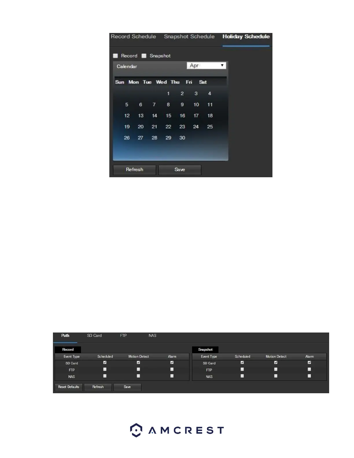 it can be customized to stop recording or snapshots for that day by using the Record and Snapshot