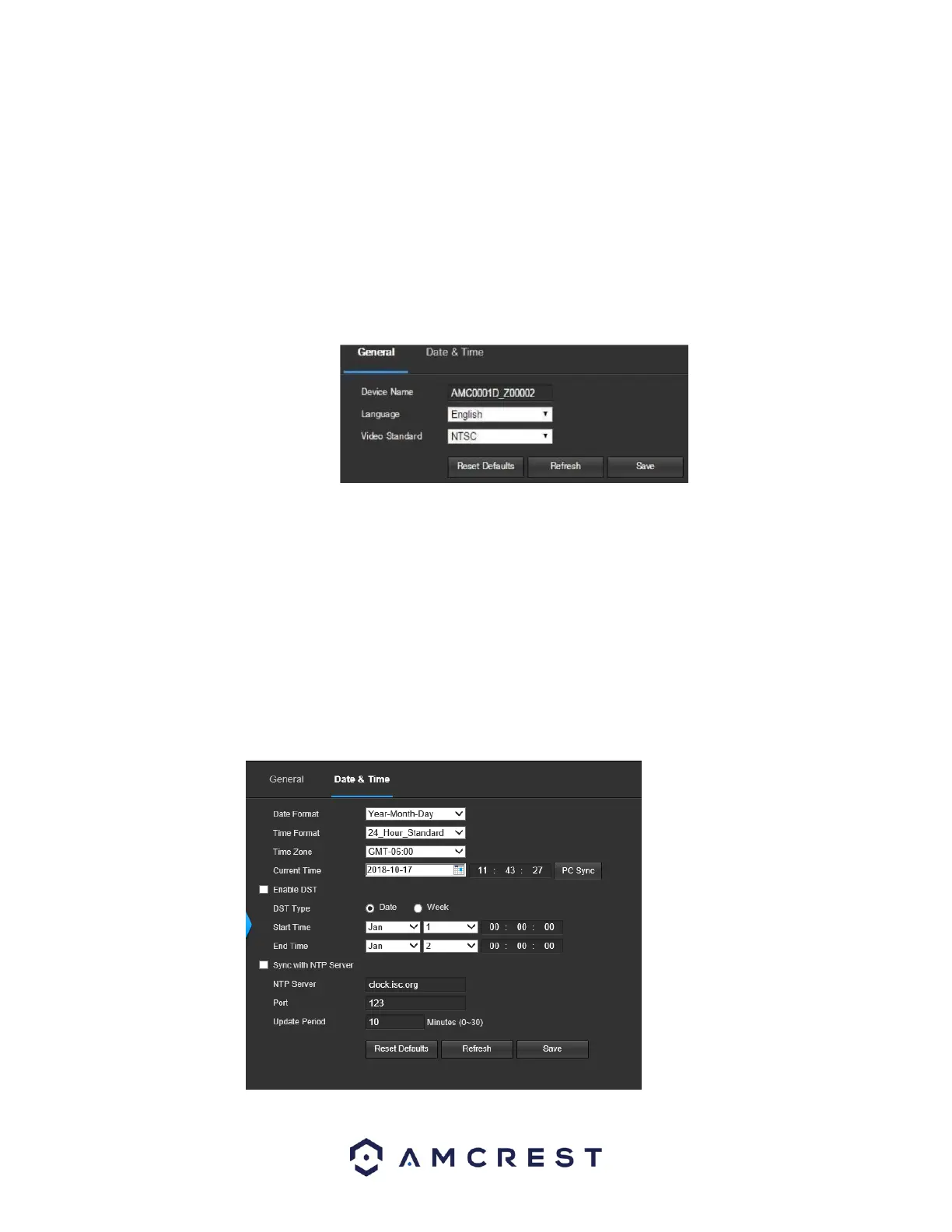 This tab is where the user can configure the date and time settings for the camera. Below is a screenshot