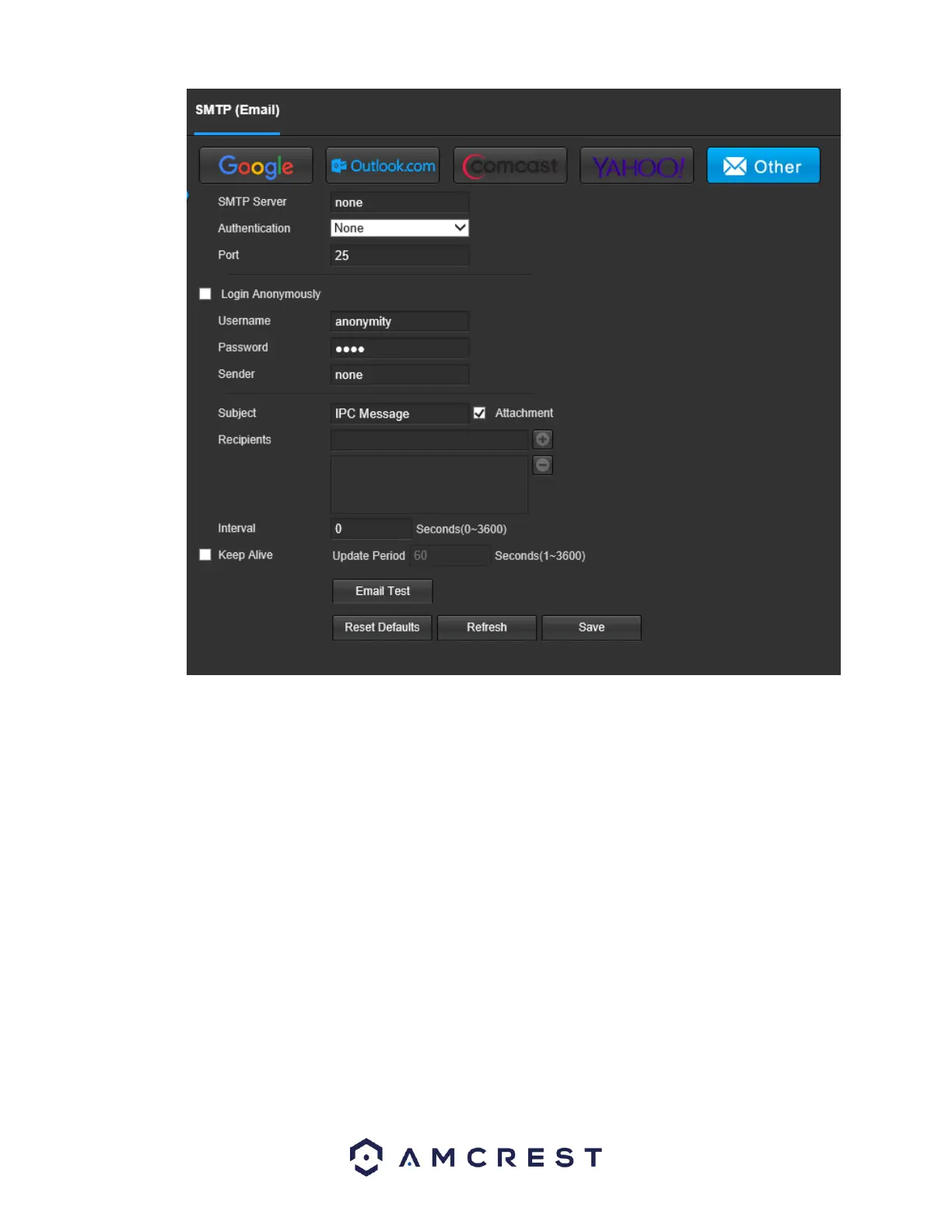 Below is an explanation of fields on the SMTP (Email) settings screen: