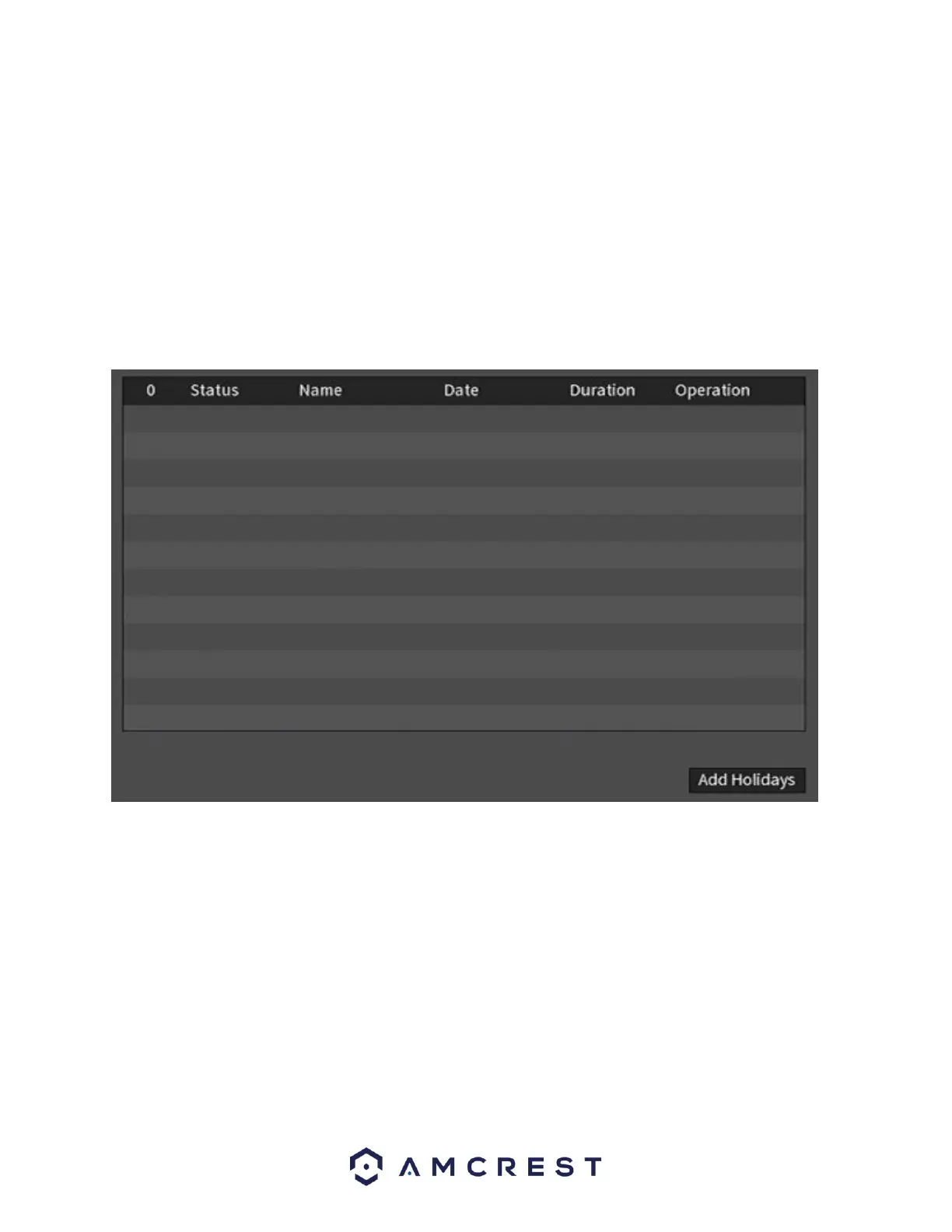 This screen allows the user to set and modify holiday settings which allows the NVR to record or