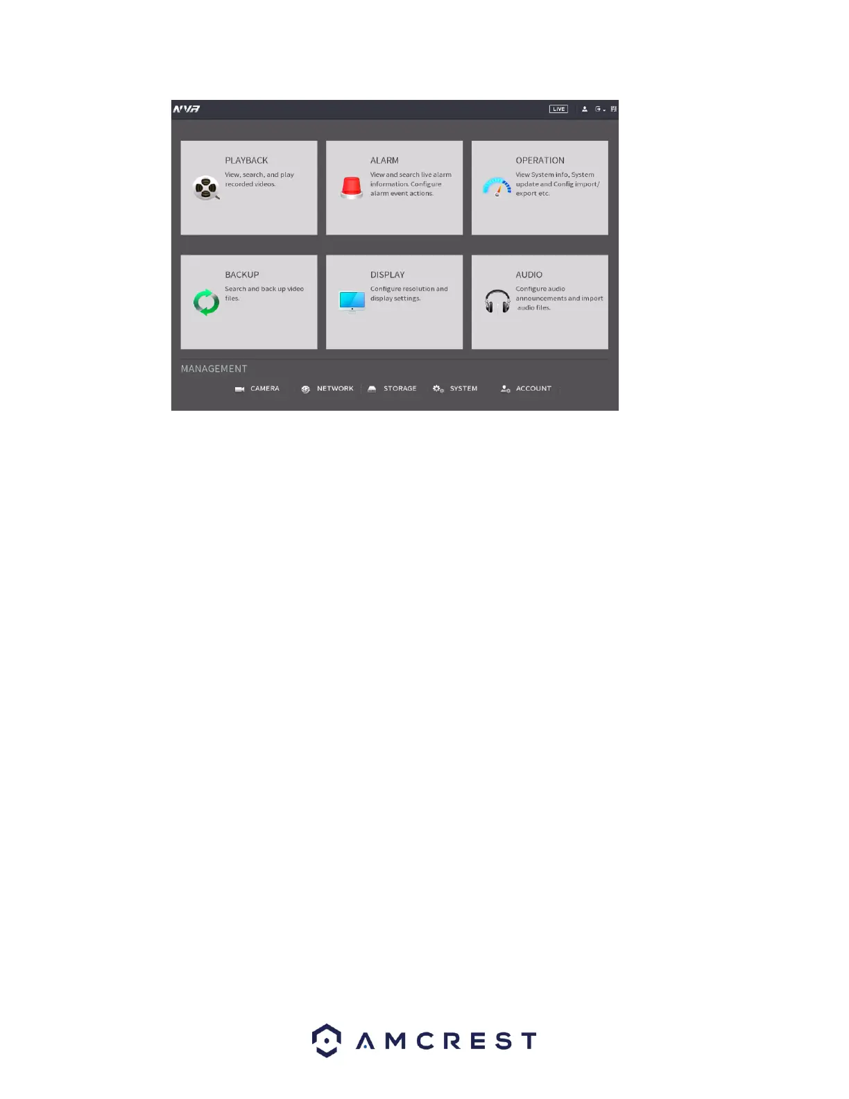 PLAYBACK: View, search, and play recorded videos.