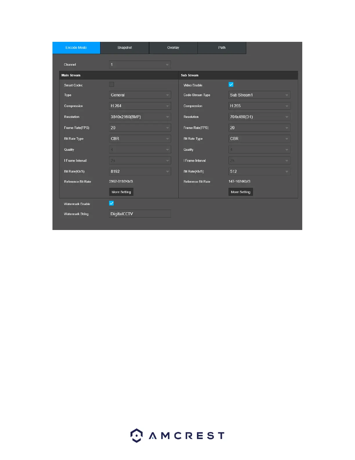 Compression: This dropdown box allows the user to select a compression protocol. Most Amcrest NVRs