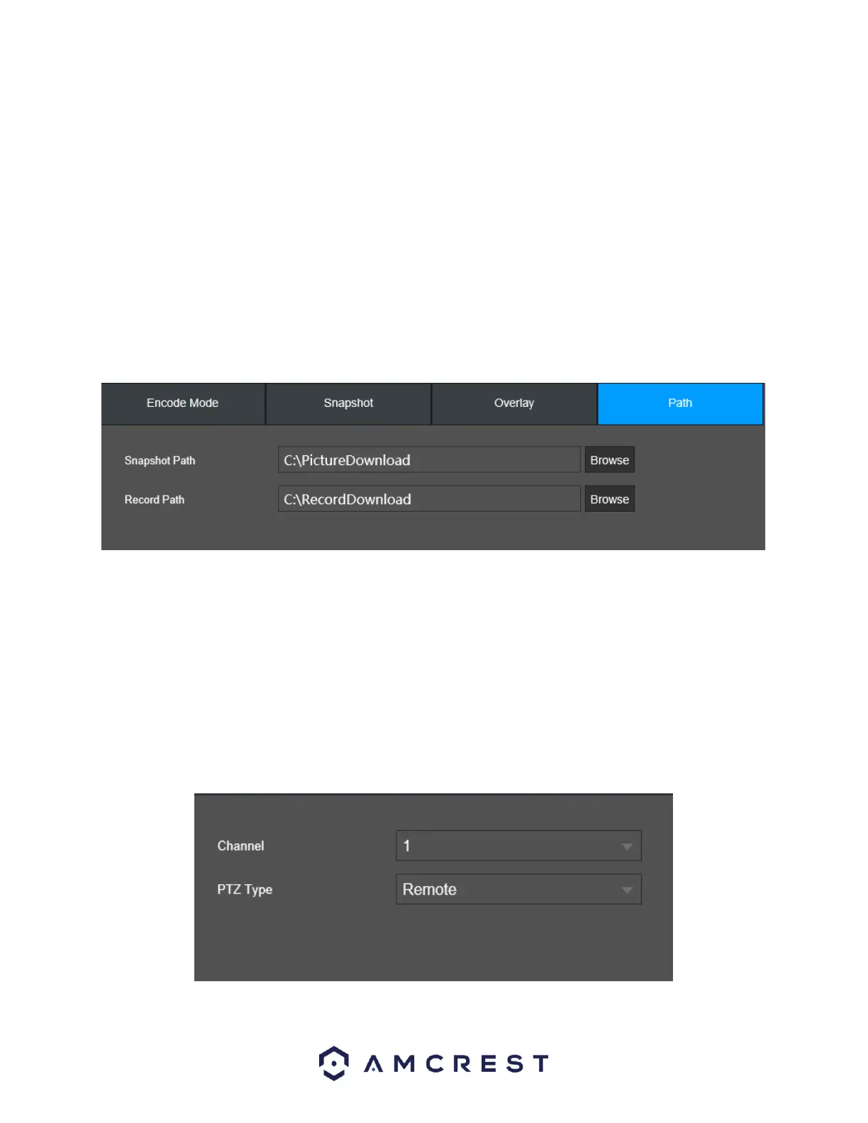 The Path tab allows the user to set a download path for snapshots and video recordings. Below is a