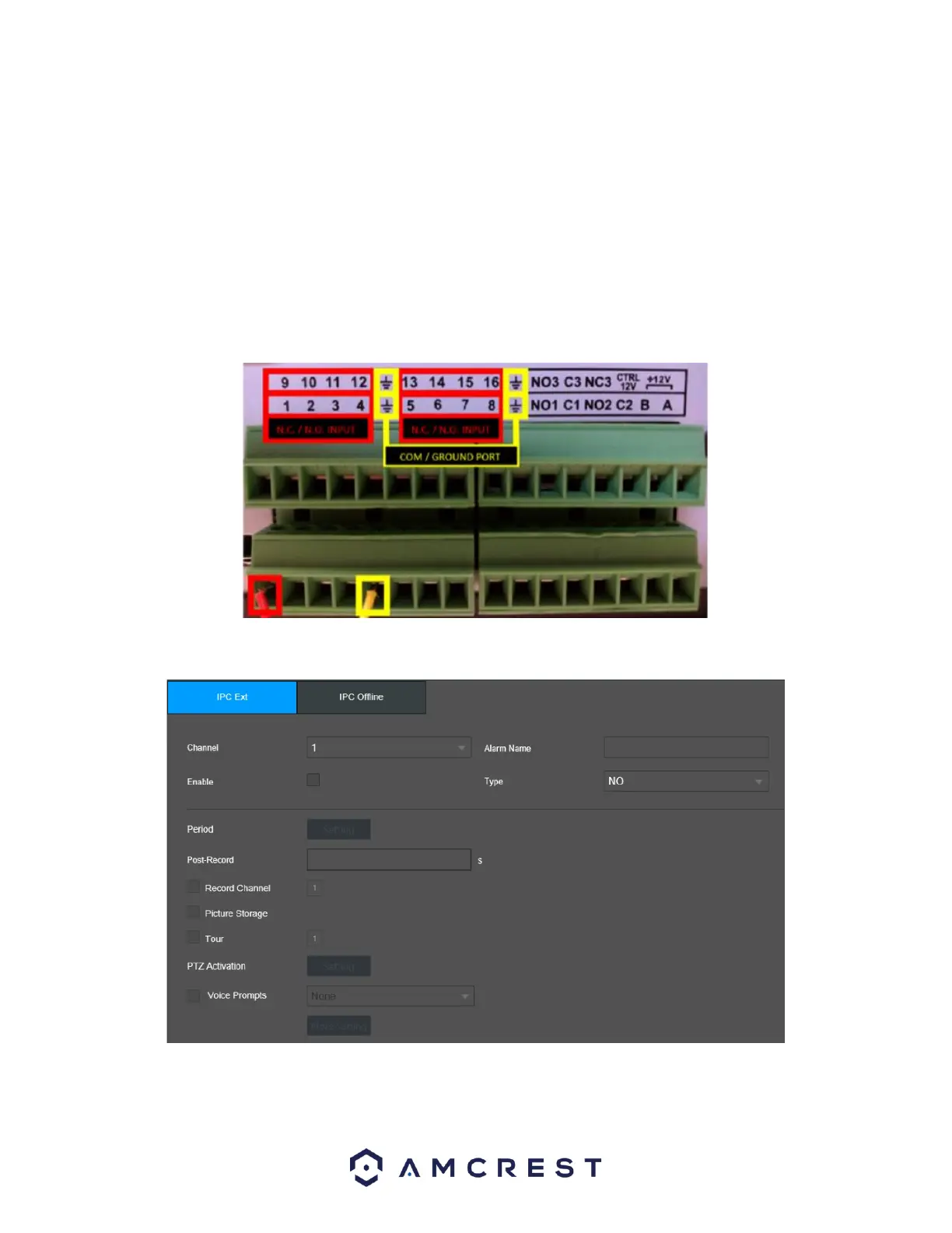2. Connect the N.C. (Normally Closed) wire to one of the numbered ports. Connect the COM wire to the