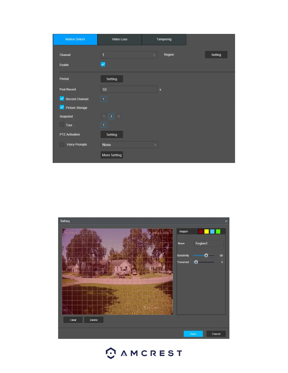 Region: The setup button takes the user to the motion detection region setup screen for that specific