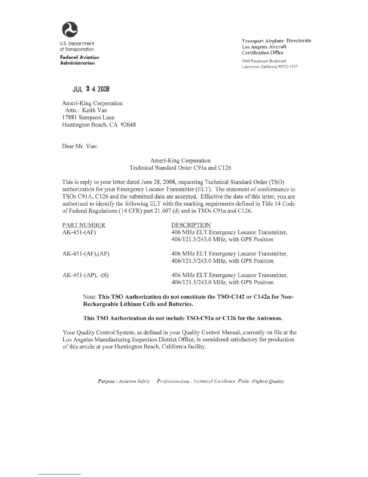 Ameri-King AK-451 Series - FAA Authorization Letter