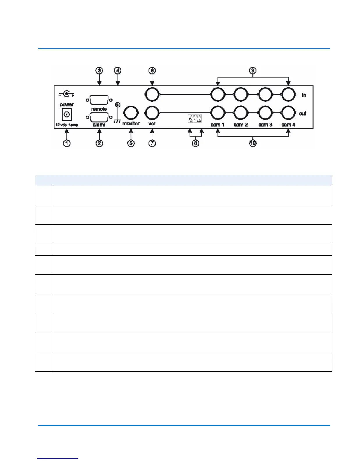 10 cam 1-4 out [sorties] — Connecteurs BNC. Livrent la sortie vidéo. Fermés