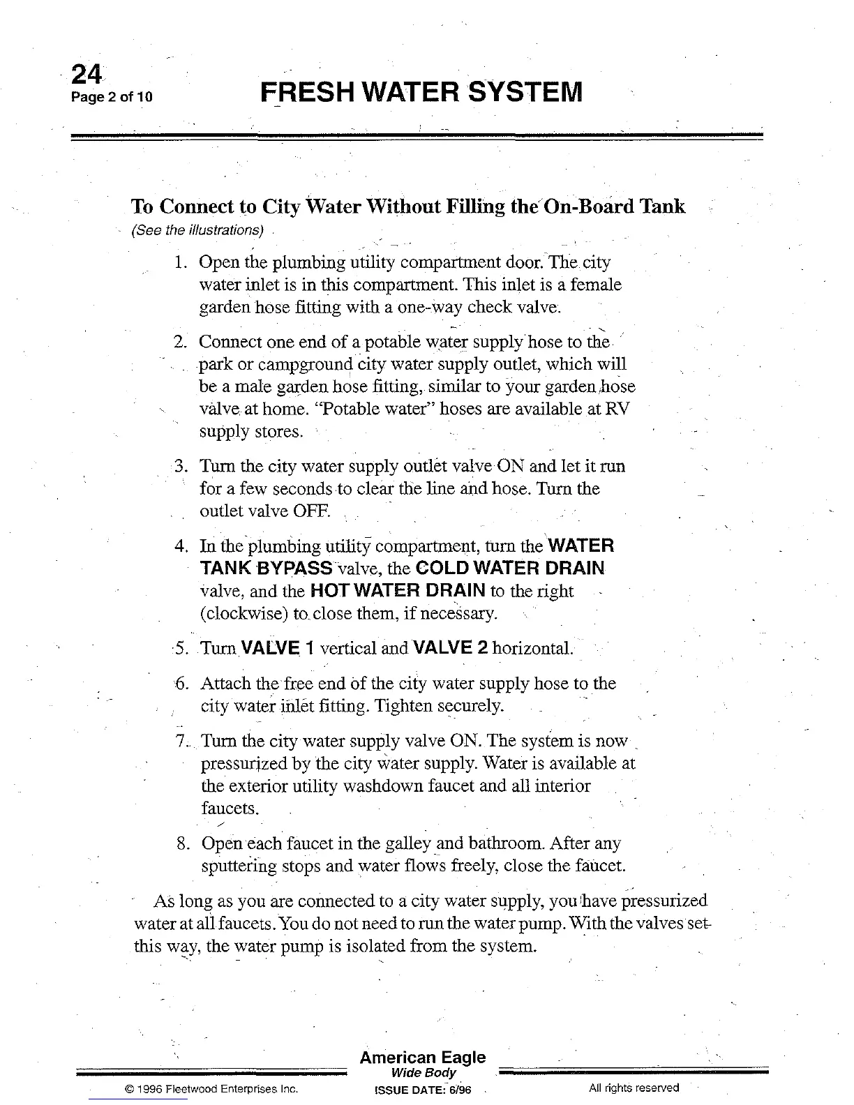 water at allfaucets. You do not need to run the water pump. With the valves