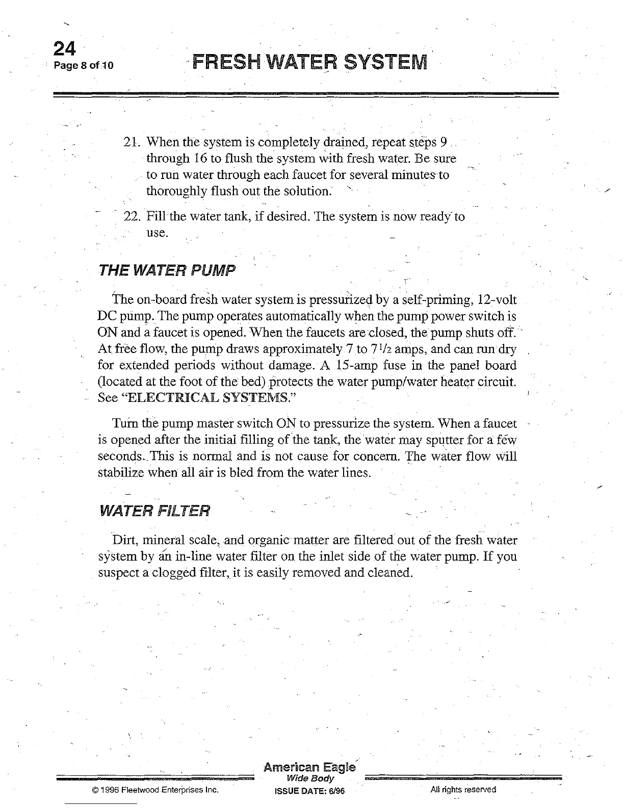 The on-board fresh water system is pressurized by a self-priming, 12-volt