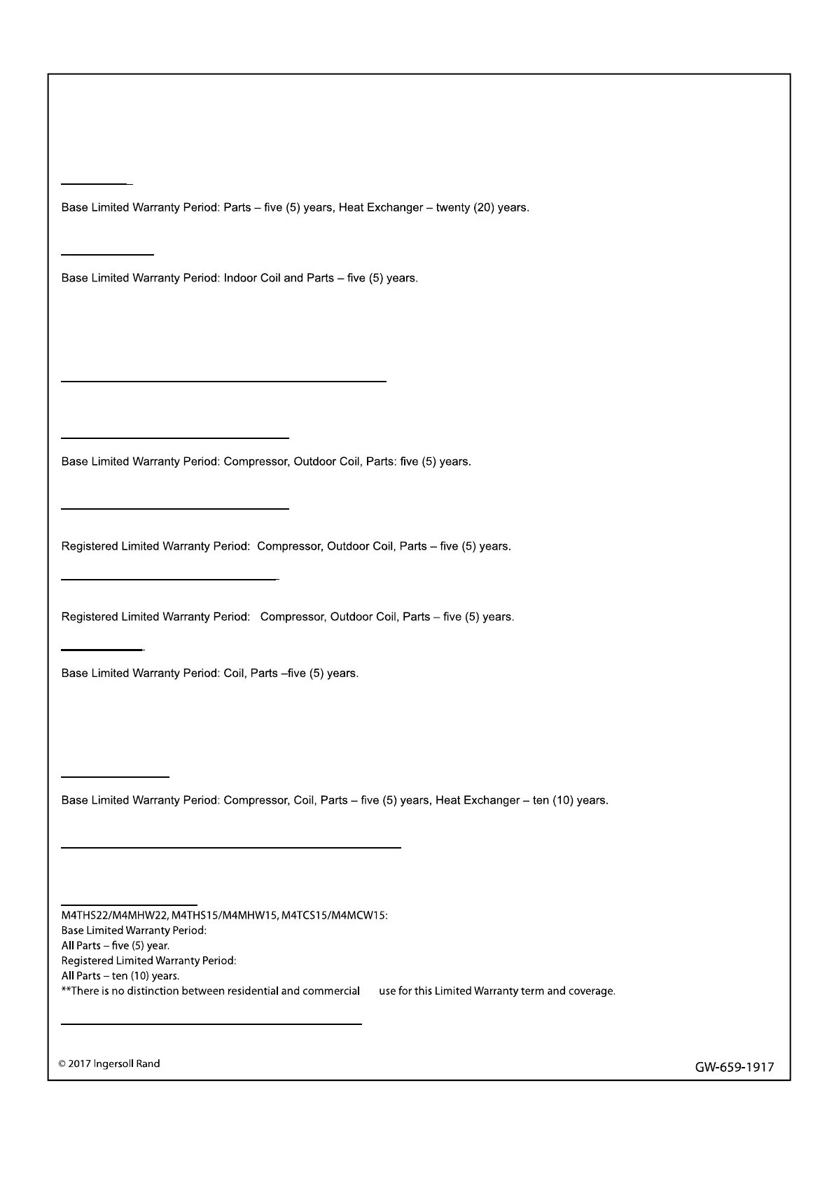 COVERAGE TERMS FOR RESIDENTIAL APPLICATIONS: Pursuant to the Ingersoll Rand (“Company”) limited warranty terms and