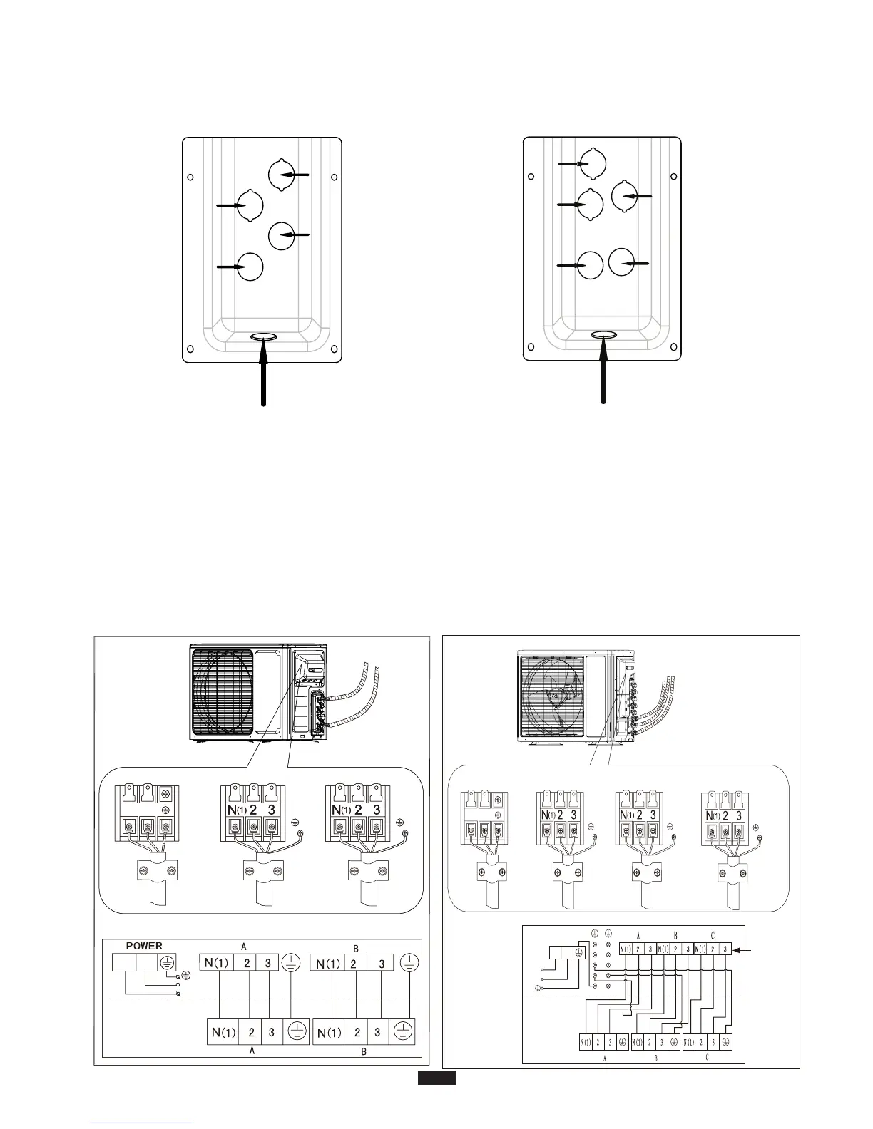 3. If connecting with three indoor units, the connection cable should be put in from hole A, B and C.
