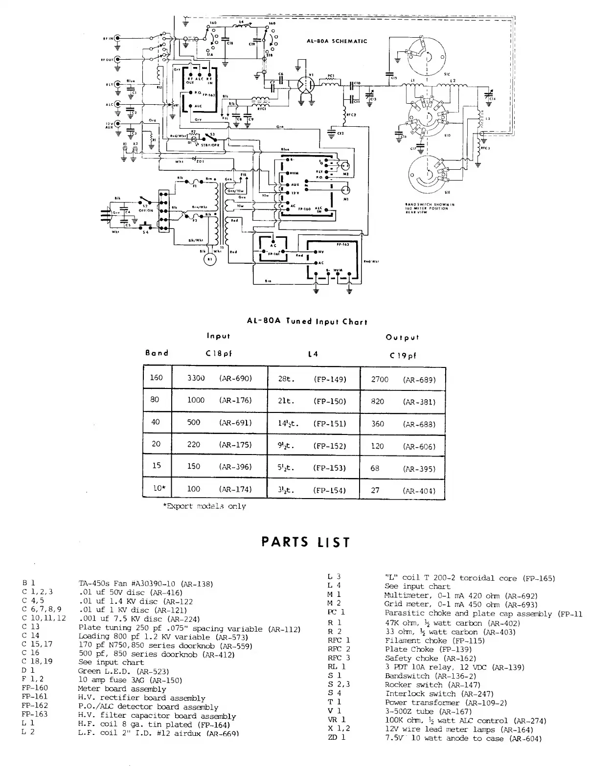 AMERITRON AL-80A - Schematics and Parts List; AL-80 A Schematic Diagram; AL-80 A Tuned Input Chart; Parts List