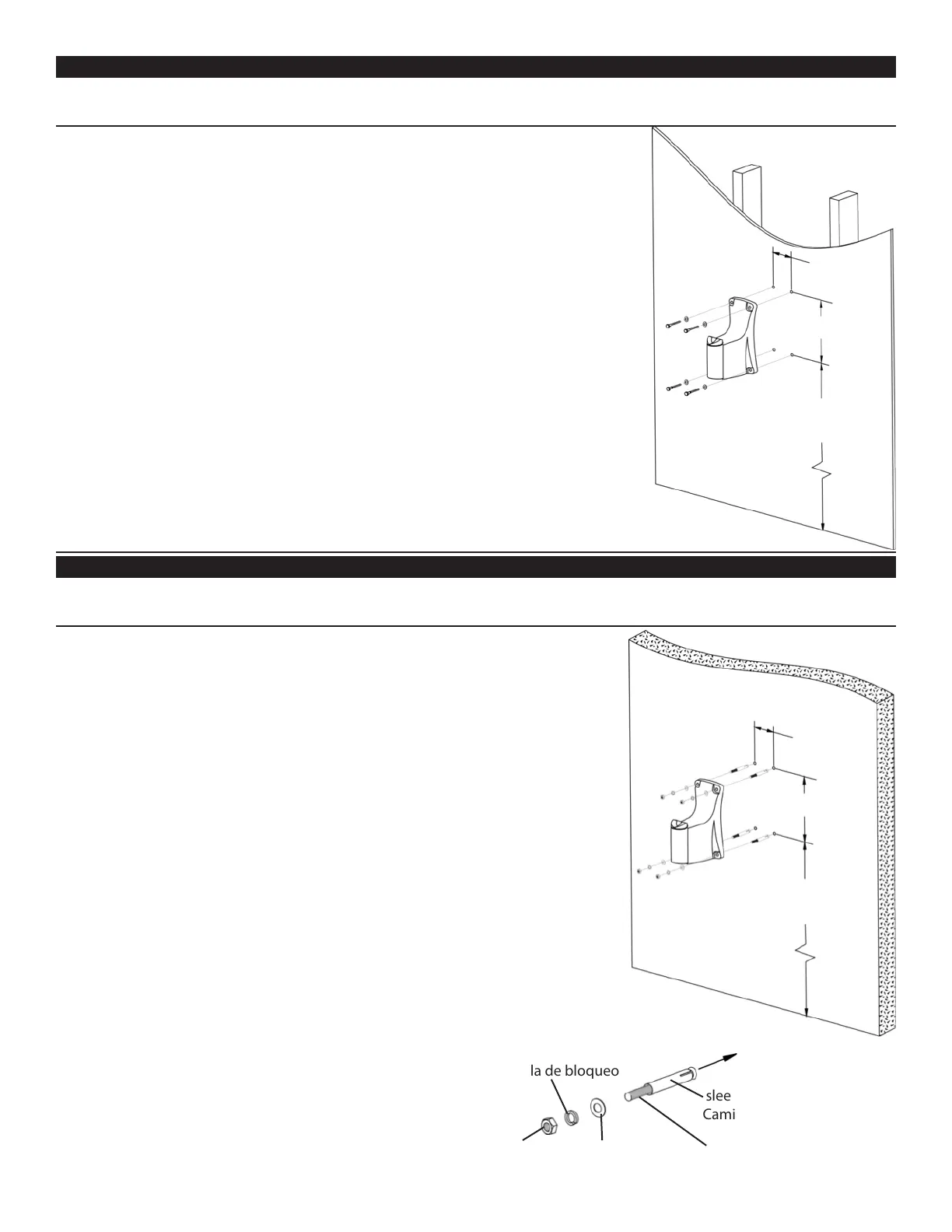 3. Instale el soporte para montaje sobre la pared, utilizando los tornillos y arandelas