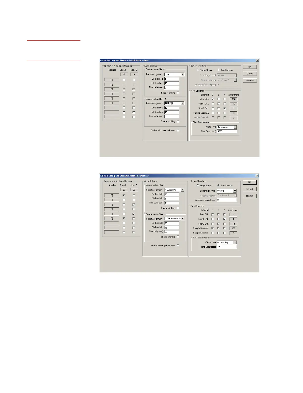The Alarm Setting and Stream Switch Parameters dialog box contains gas