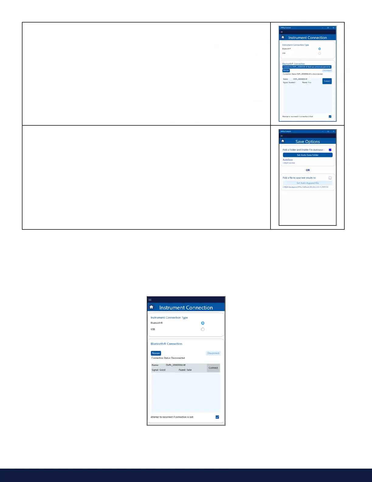 DVPlus Connect App enables the user to connect to the DVPlus instrument via Bluetooth® or USB (see Figure 5).