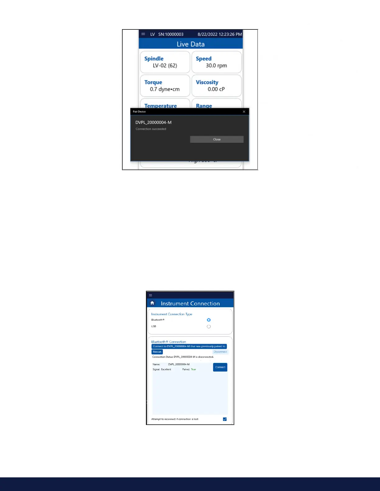 • Launch the DVPlus Connect app and click either Connect or Connect to a previously paired instrument