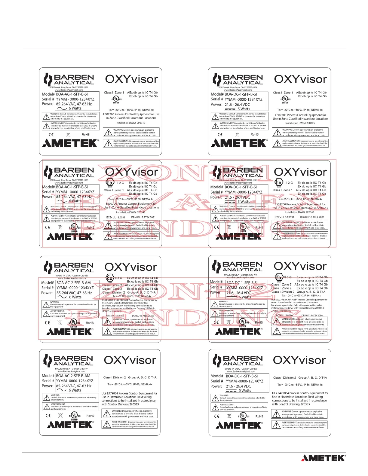 Ametek OXYvisor - Example Product Labels; Name Plate - (Pending Final Approvals); Figure 7 - Examples of Oxyvisor Product Label; Name Plate