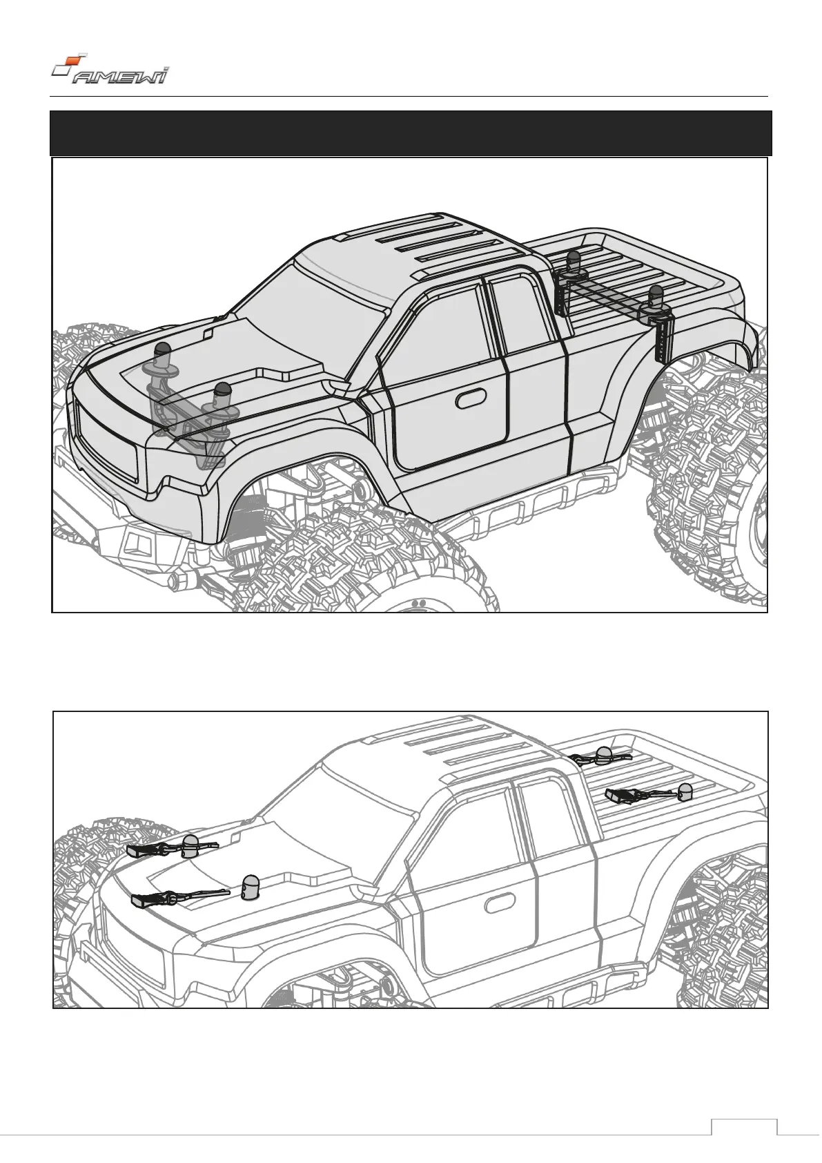 Aline the 4 holes of the car body with the body pillars, then install it.