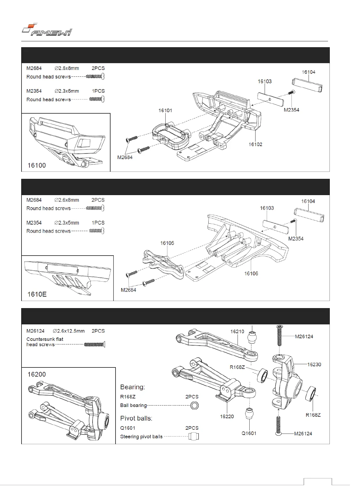Amewi HYPER GO - Front Bumper Assembly (Models 22627 & 22628); Front Bumper Assembly (Model 22629); Front Swing Set Assembly