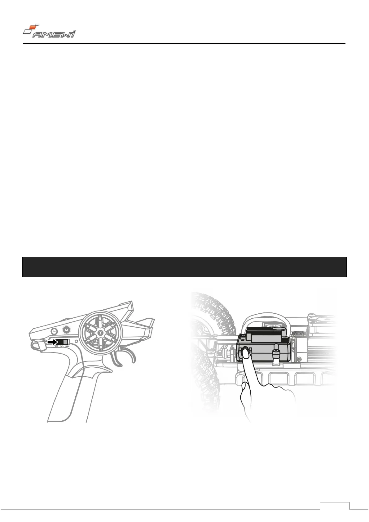 Press the car’s power switch button on the side of the ESC, the indicator light of the car flashes.