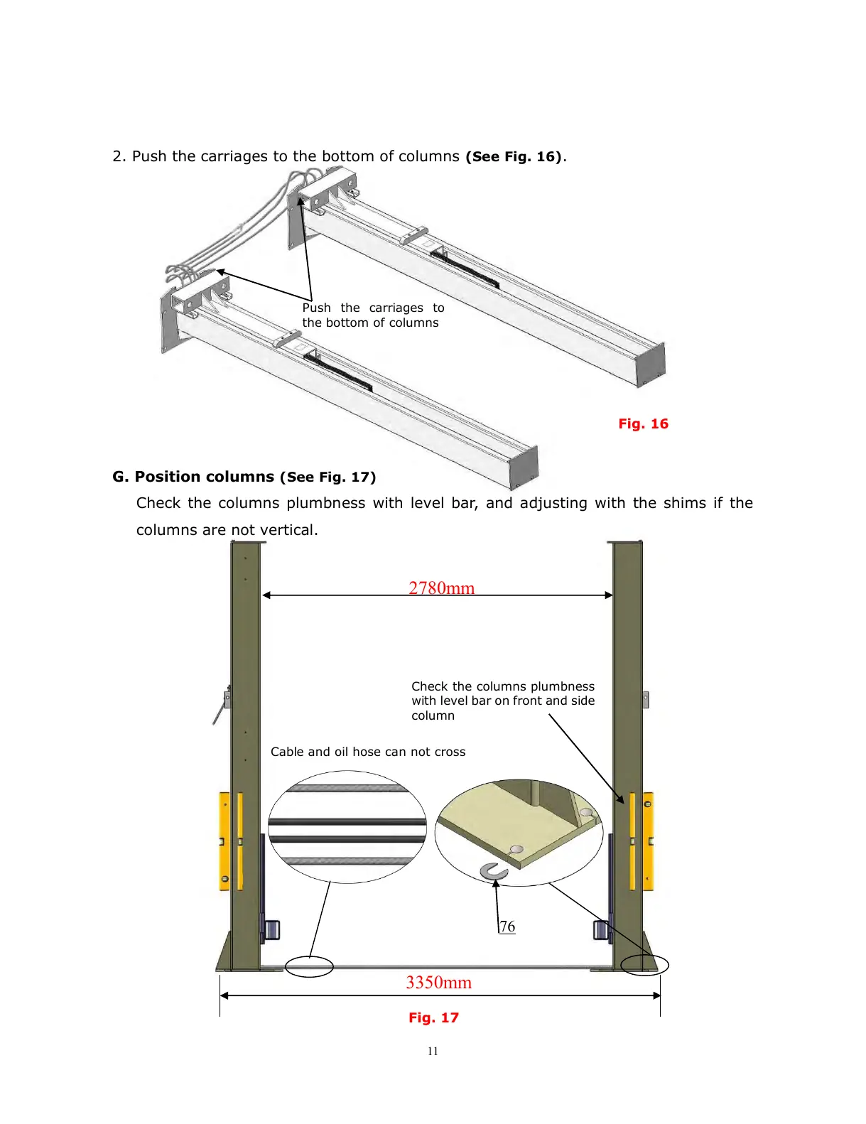 2. Push the carriages to the bottom of columns (See Fig. 16).