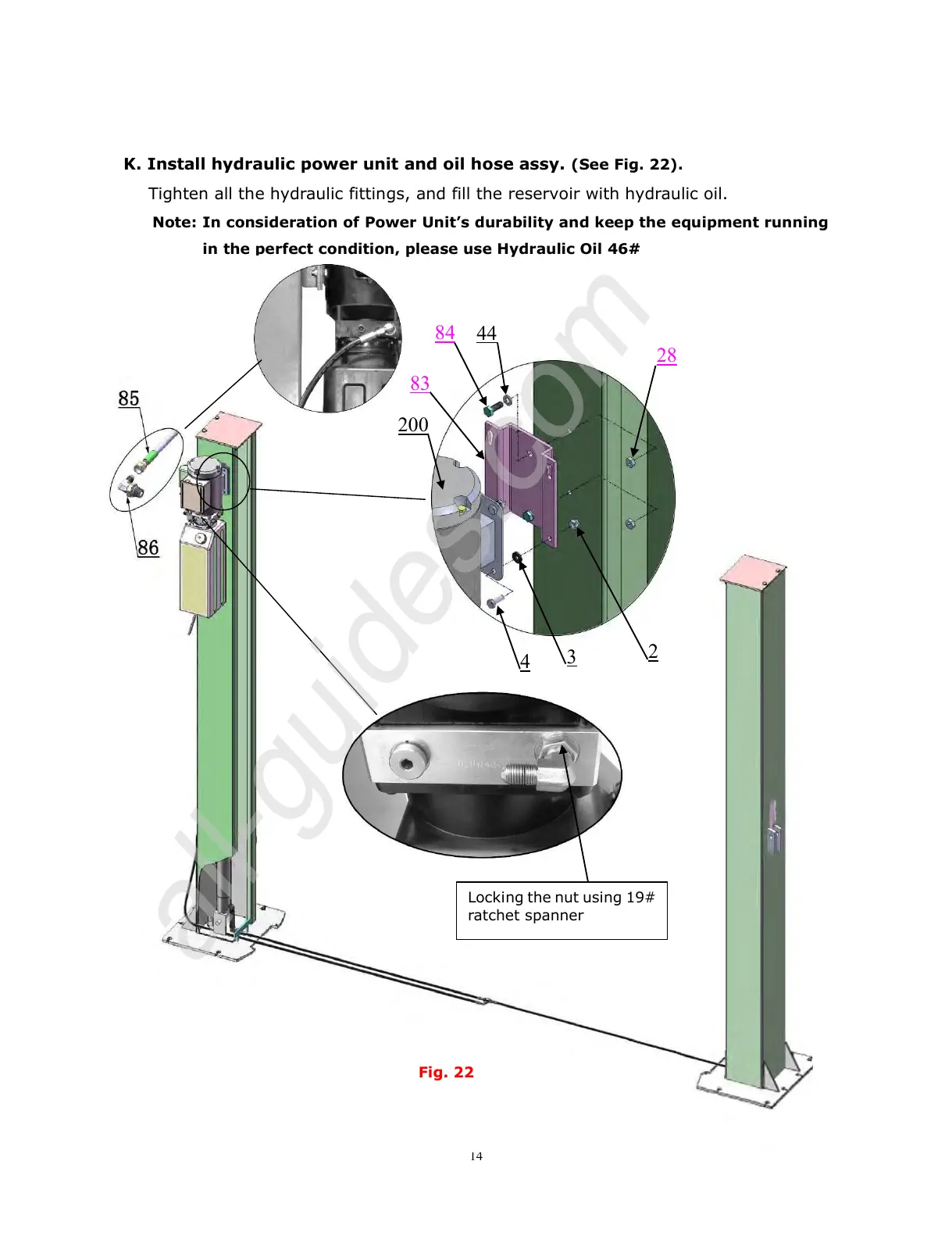 K. Install hydraulic power unit and oil hose assy. (See Fig. 22).