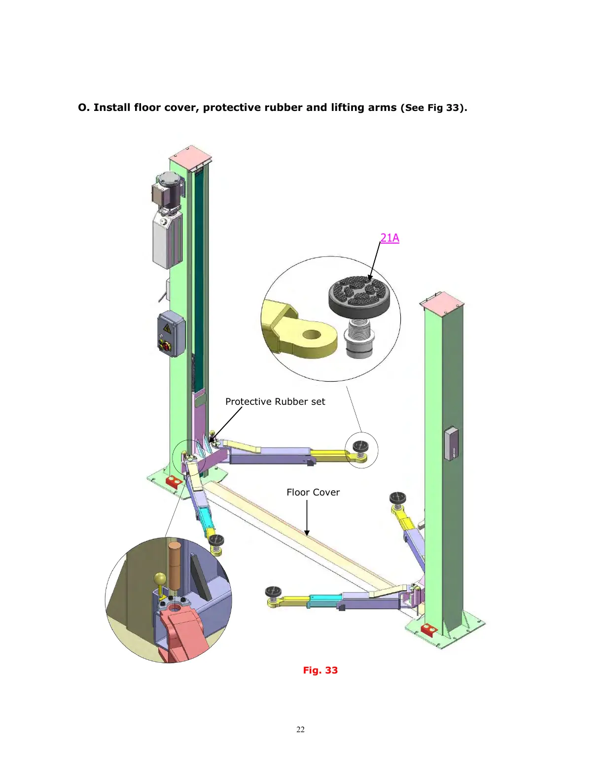 O. Install floor cover, protective rubber and lifting arms (See Fig 33).