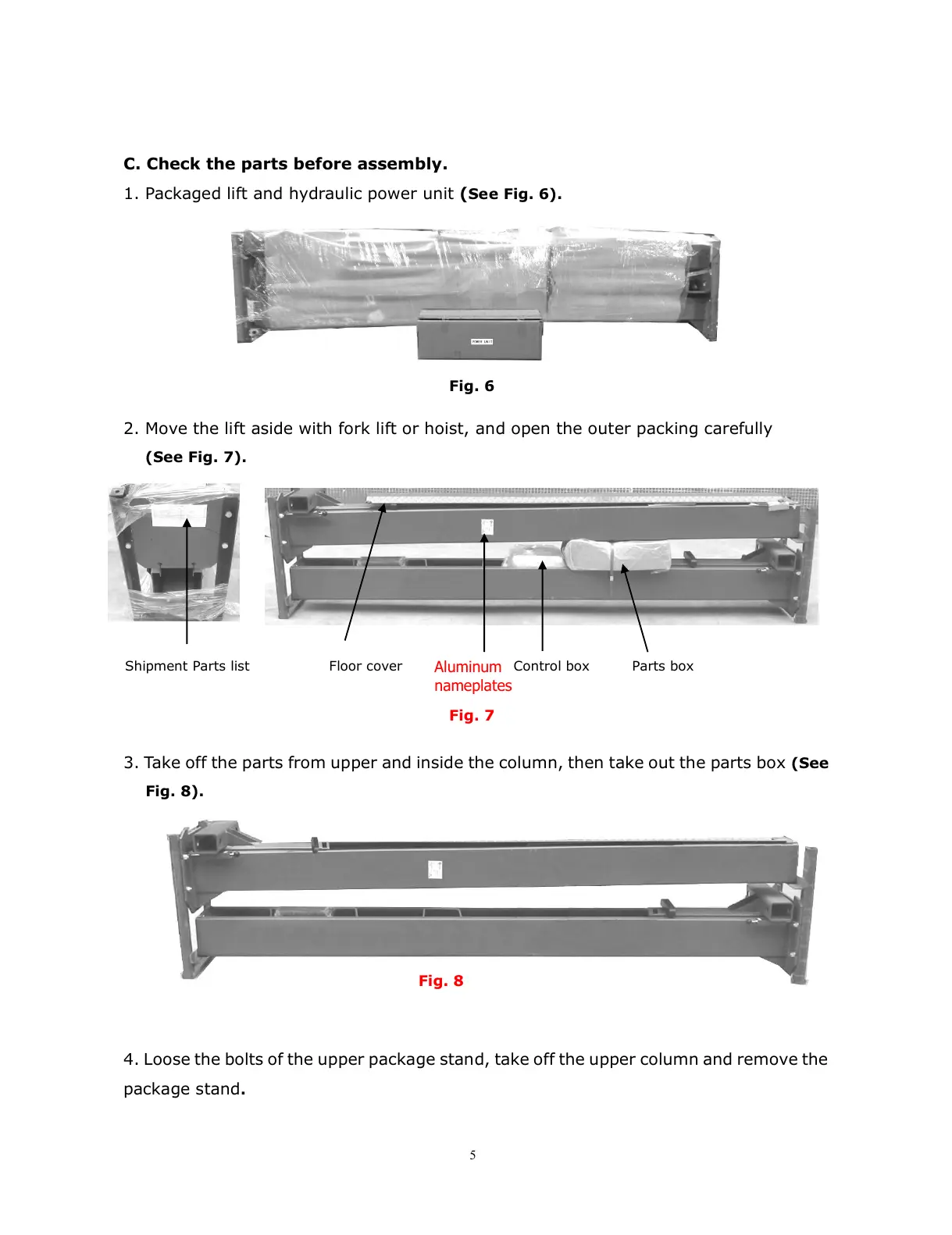 2. Move the lift aside with fork lift or hoist, and open the outer packing carefully