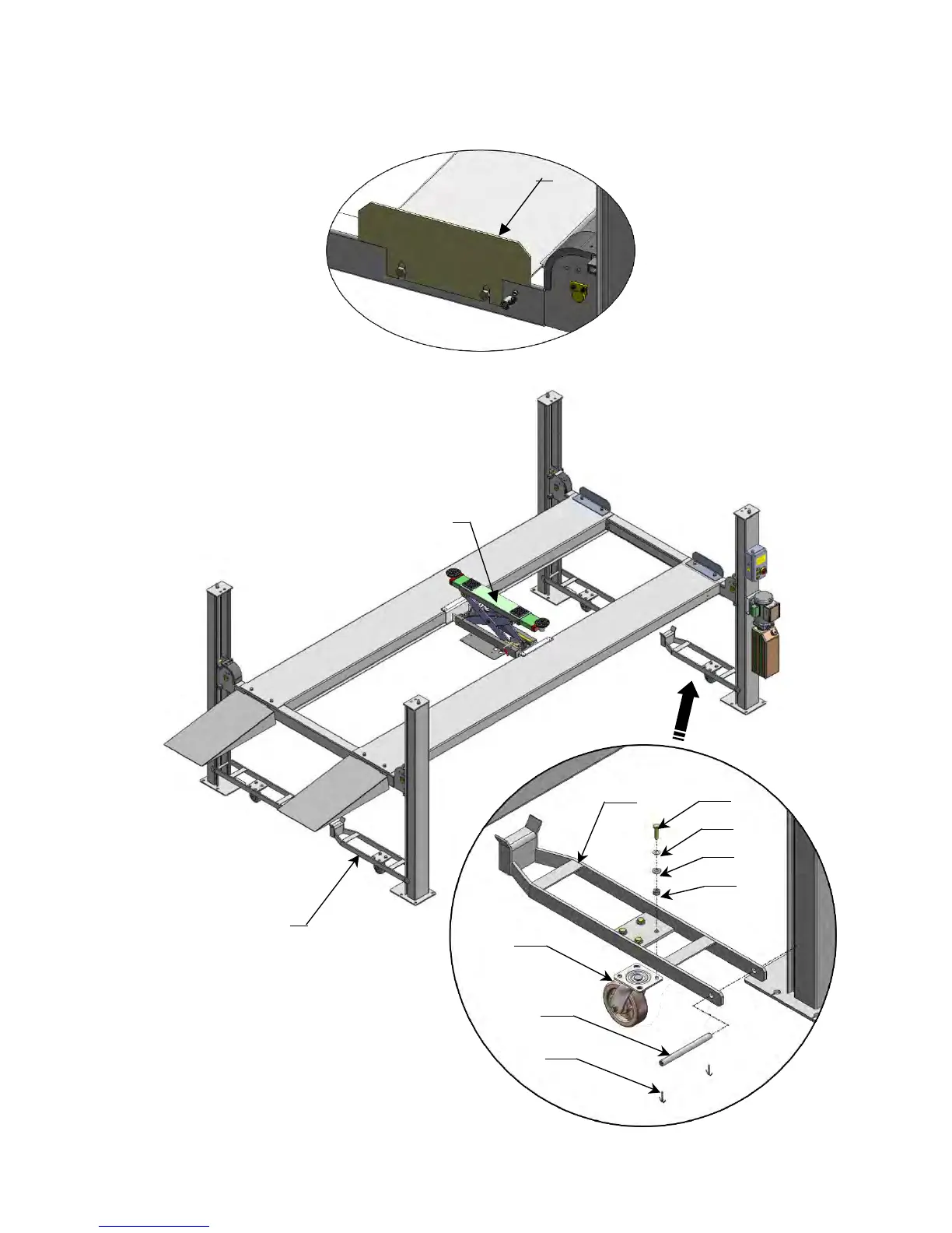 After driving the vehicle on the lift, take off the drive-in ramp, install rear wheel stop plates