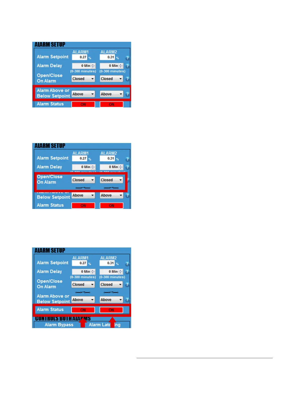 Each alarm will be triggered above or below setpoint as you