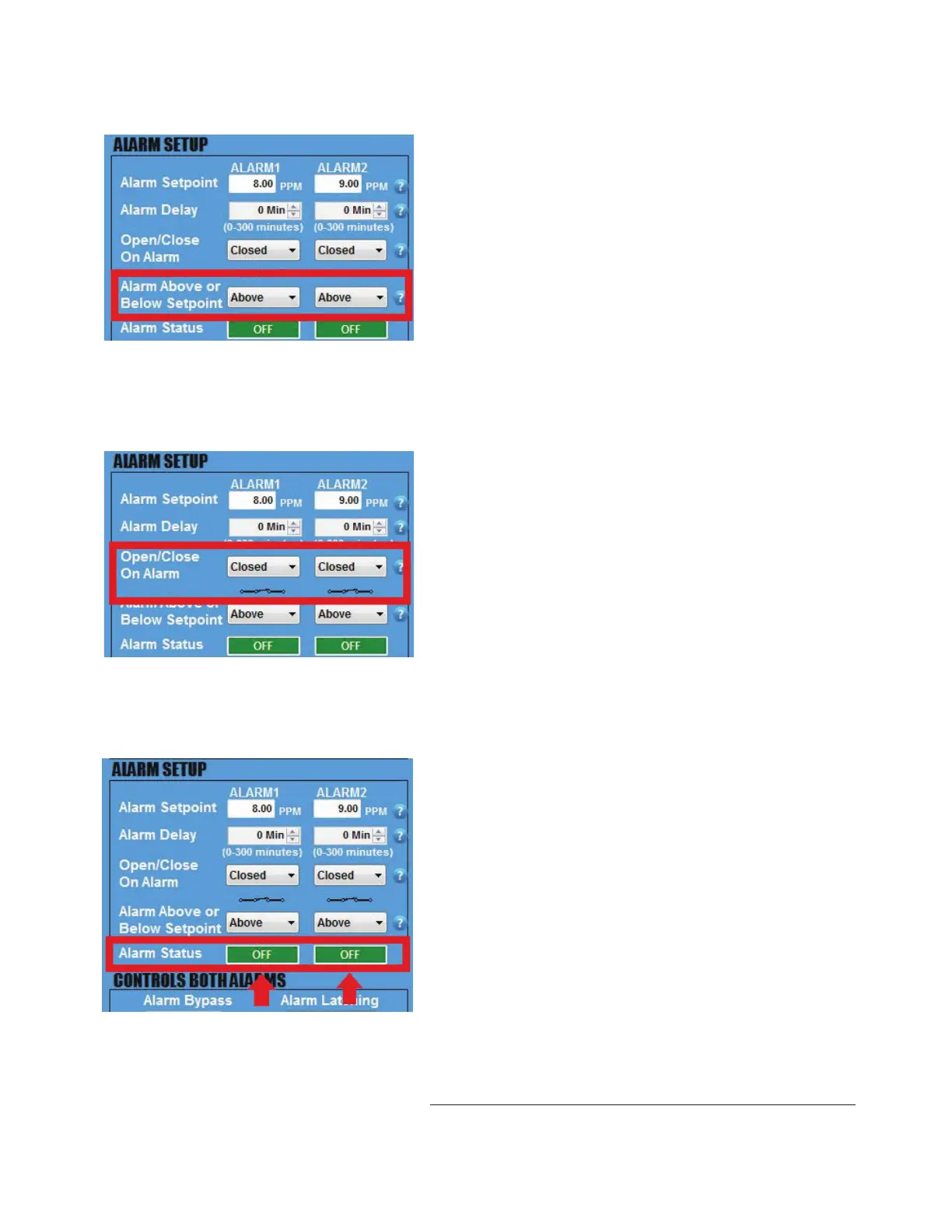 Each alarm will be triggered above or below setpoint as you