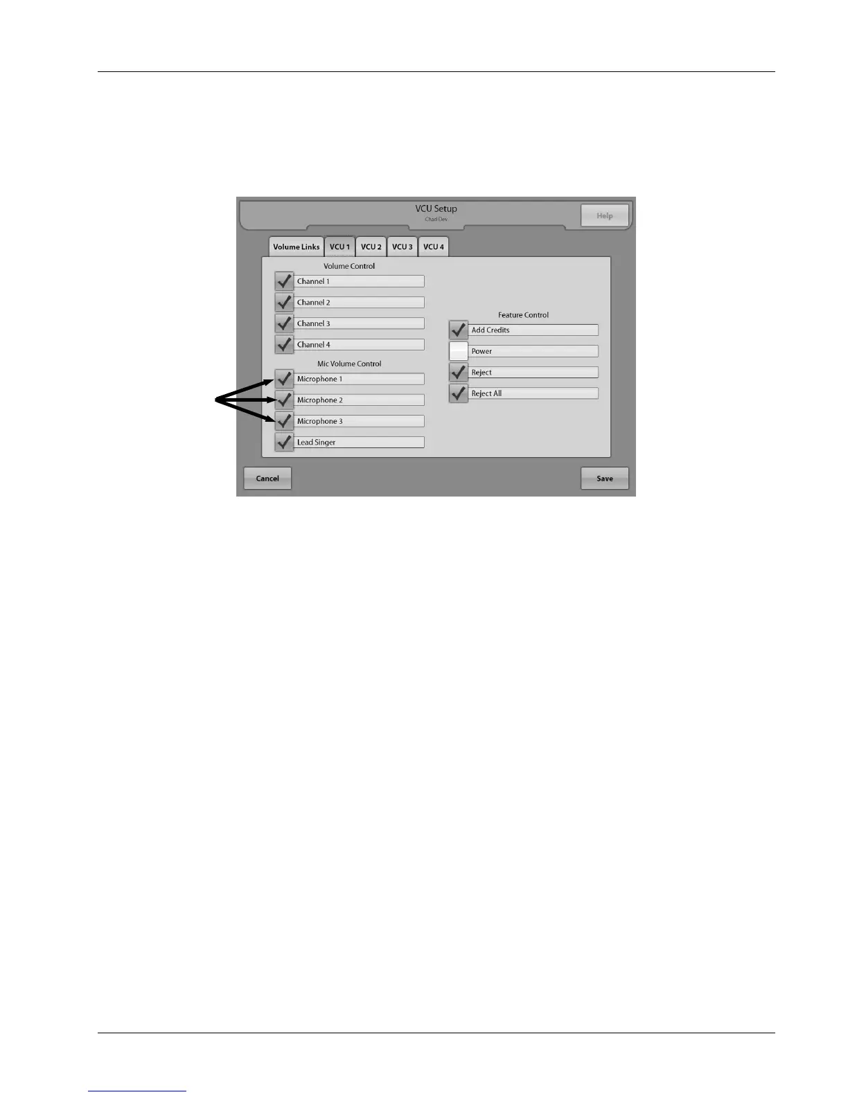 • In the tabs VCU1–VCU4, remove the check marks in the columns corresponding with the microphones